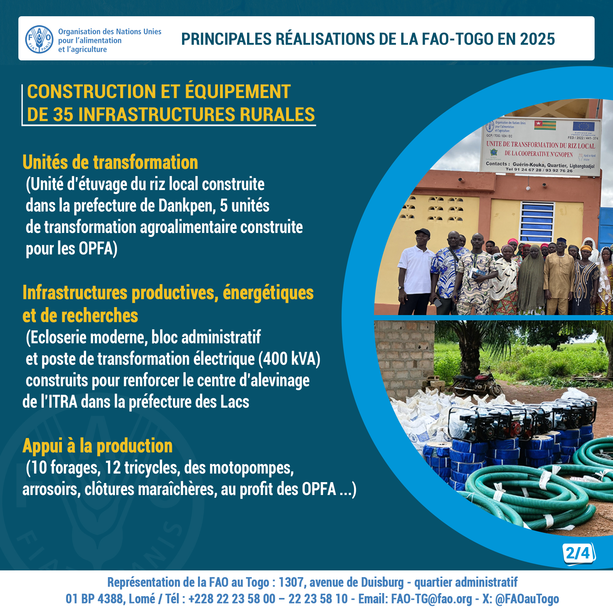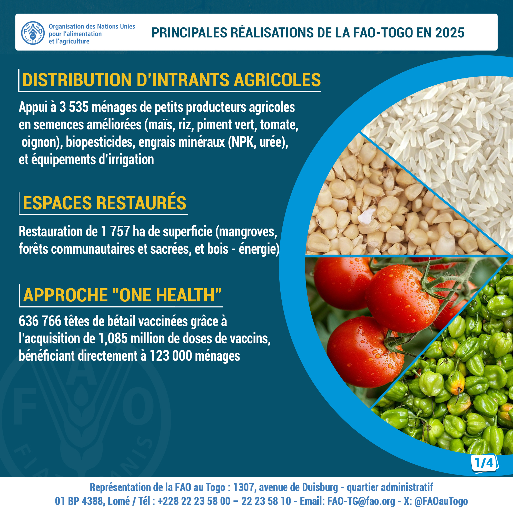 Au total, la FAO a soutenu le Togo à hauteur de 3,5 milliards FCFA, selon sa publication sur X le 19 février 2026. Ces fonds ont servi entre autres à la modernisation des infrastructures, au renforcement des capacités et à un soutien direct aux petits producteurs.