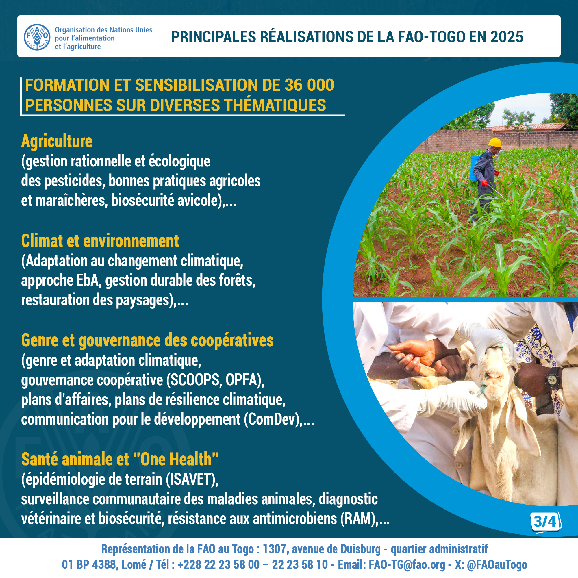 Au-delà du matériel, la FAO a misé sur le savoir. Ce ne sont pas moins de 36 000 personnes qui ont bénéficié de formations et de sensibilisations. Les thématiques abordées reflètent les défis contemporains :