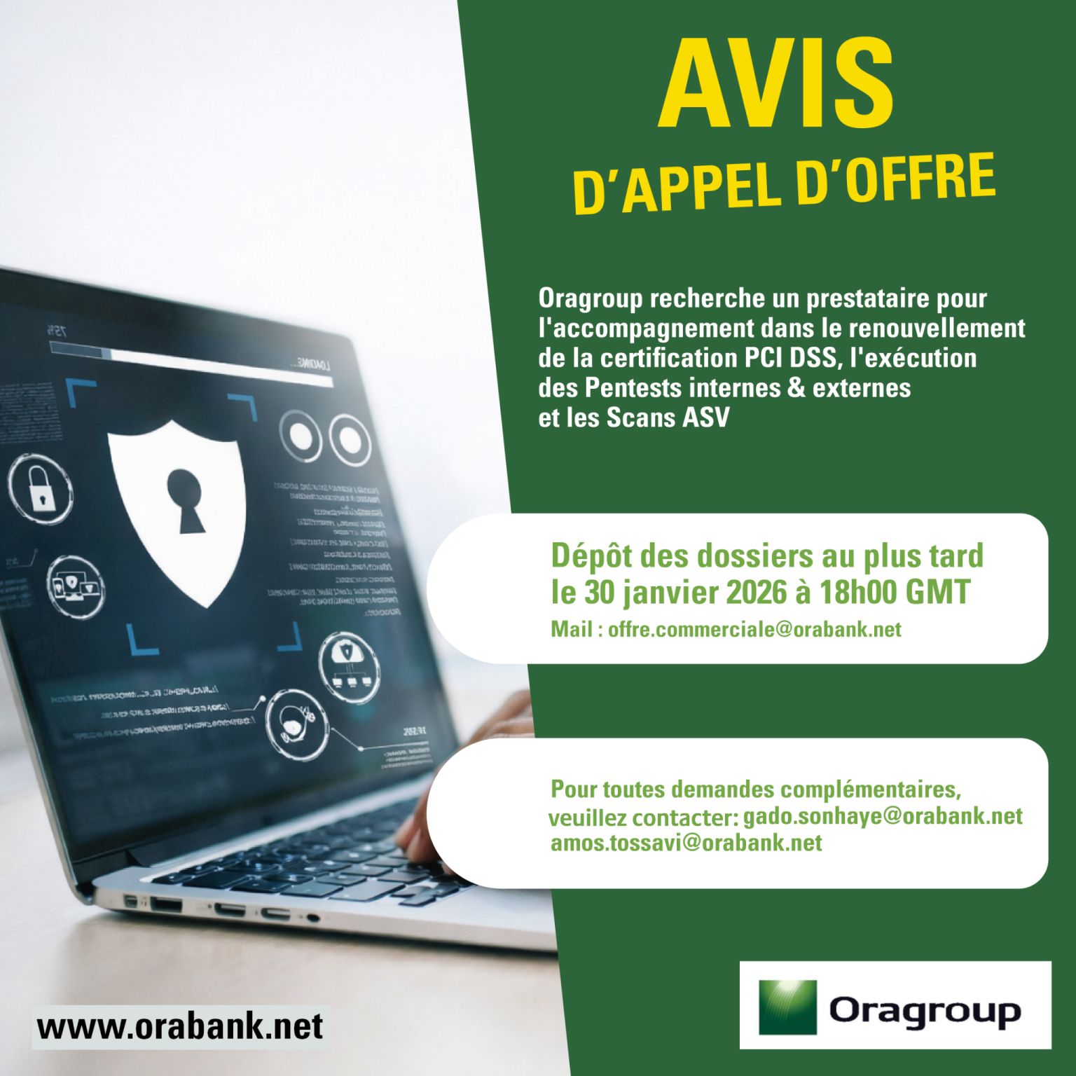 Le Groupe Orabank est présent dans 12 pays d’Afrique de l’ouest et du centre. Il est organisé comme suit : – Holding du Groupe à Lomé au Togo ; – 12 filiales ou succursales repartis dans les pays suivants : Bénin, Burkina Faso, Côte d’Ivoire, Gabon, Guinée, Guinée Bissau, Mali, Mauritanie, Niger, Sénégal, Tchad et Togo. Dans le cadre de ses obligations de management de la sécurité du Système d’information, le groupe envisage la poursuite des activités suivantes : – Tests de vulnérabilités (pentests internes et externes, Scans ASV) sur tous les sites Orabank – Accompagnement au maintien des certificats PCI-DSS dans les 12 filiales Orabank Il est donc plus que jamais nécessaire pour Orabank de s’assurer que : – d’une part que le système d’information ne contient pas de vulnérabilités susceptibles de l’exposer à une attaque cyber – d’autre part que les données sensibles concernant la monétique et les produits digitaux financiers de notre institution sont sécurisées et sont aligné rapport aux exigences de la norme PCI-DSS