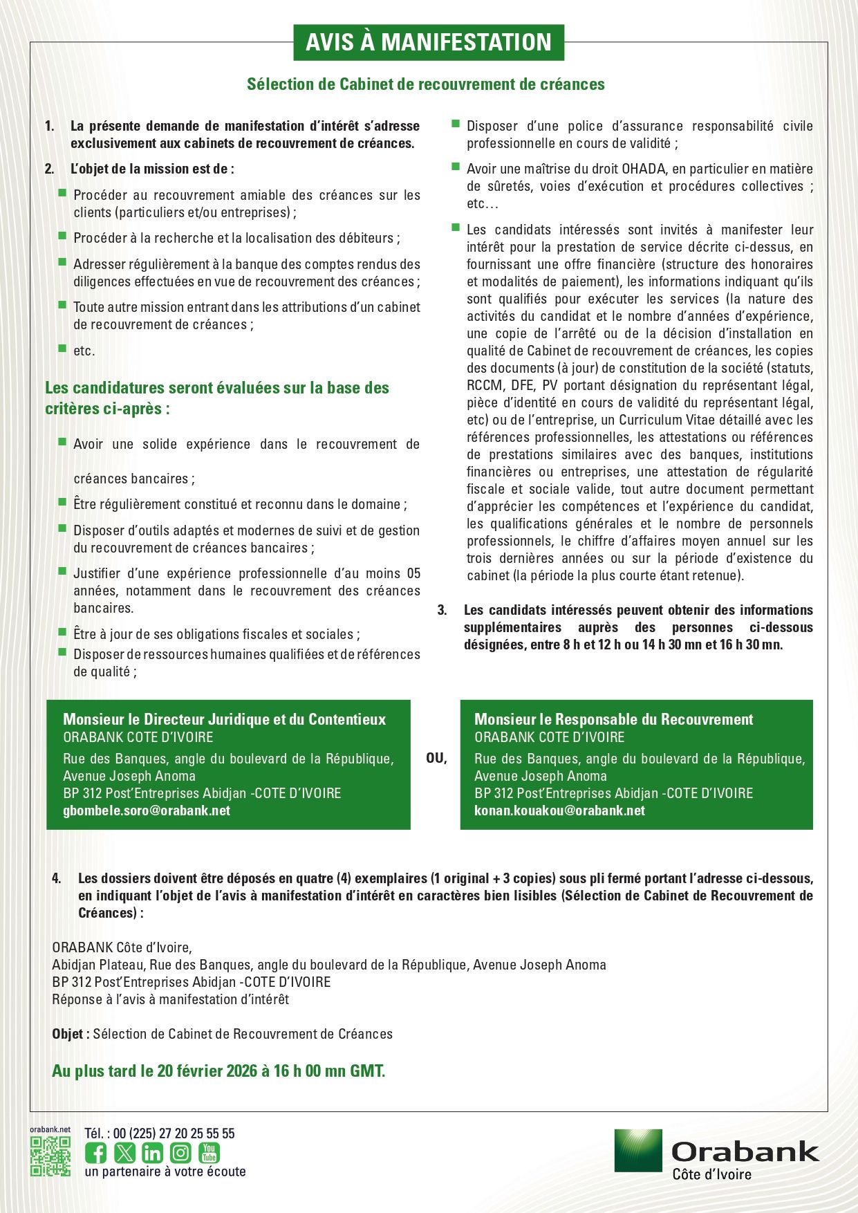 Orabank Côte d’Ivoire lance un appel à candidatures pour la sélection d’un cabinet de recouvrement de créances.