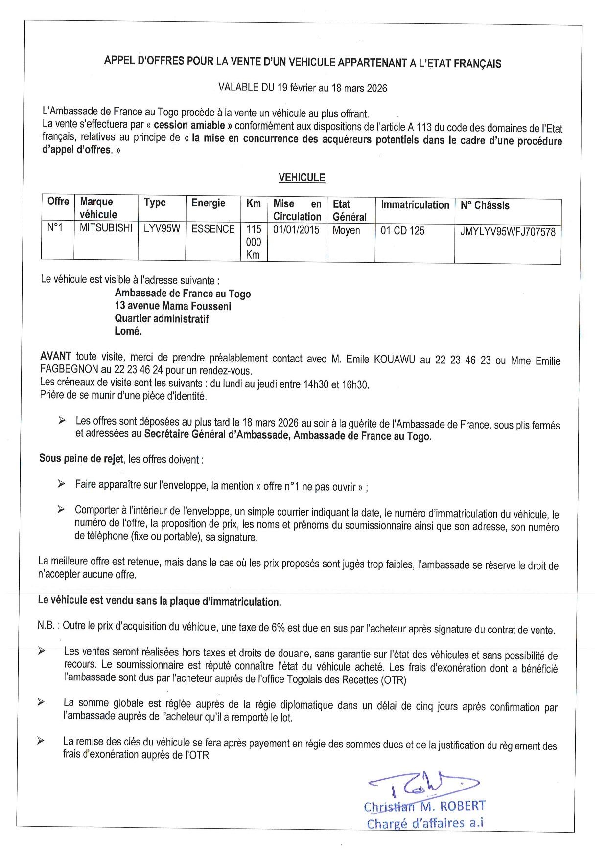 APPEL D’OFFRES POUR LA VENTE D’UN VEHICULE APPARTENANT A L’ETAT FRANÇAIS VALABLE DU 19 février au 18 mars 2026