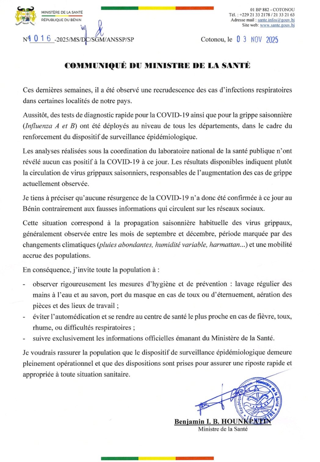 Le 3 novembre 2025, le Ministre de la santé, Professeur Benjamin HOUNKPATIN a rassuré la population dans un communiqué.