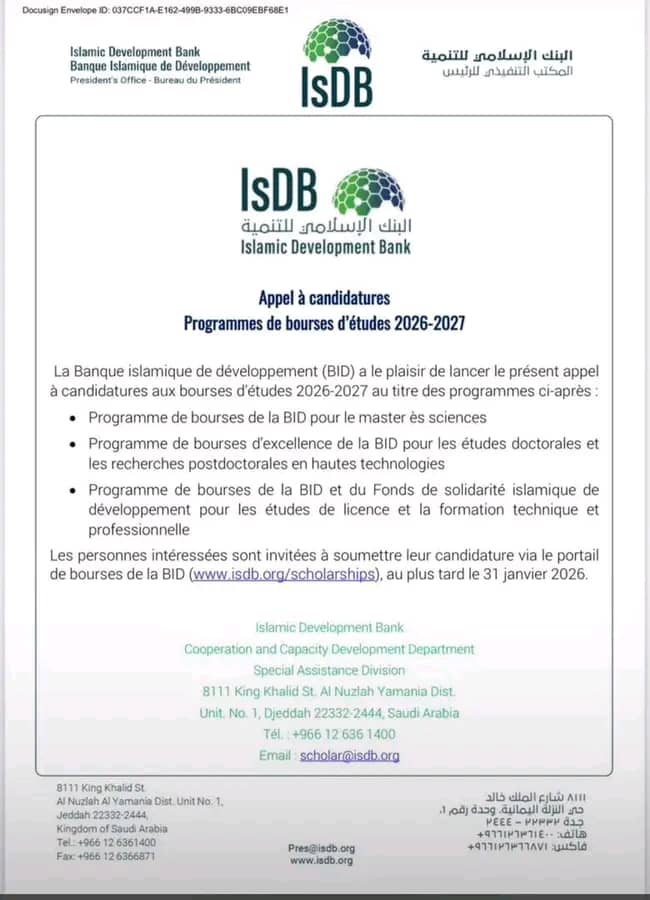 Les personnes intéressées sont invitées à soumettre leur candidature via le portail de bourses de la BID (www.isdb.org/scholarships), au plus tard le 31 janvier 2026.