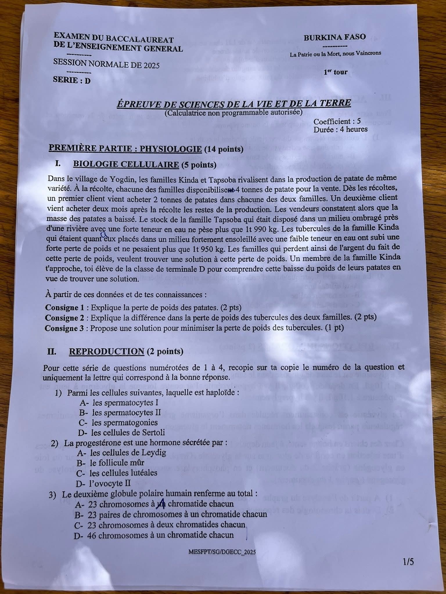 Ce mercredi 25 juin 2025, les candidats de la série D du BAC au Burkina Faso ont composé dans l’épreuve de Sciences de la Vie et de la Terre (SVT).