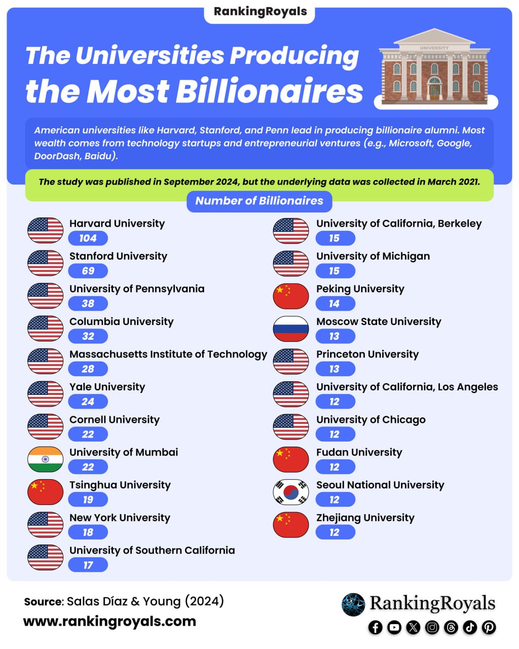 Les universités américaines comme Harvard, Stanford et l’Université de Pennsylvanie dominent dans la production d’anciens étudiants devenus milliardaires.