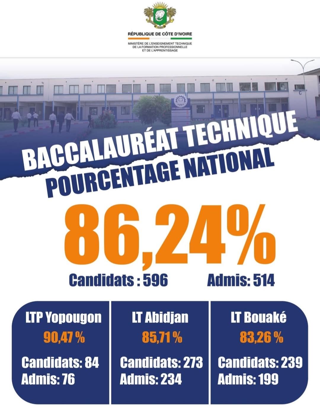 Le lycée Technique d’Abidjan affiche un taux de 85,71 %, avec 239 admis sur 273 candidats, tandis que le lycée Technique de Bouaké comptabilise 199 admis sur 239 élèves, soit un taux de réussite de 83,26 %.