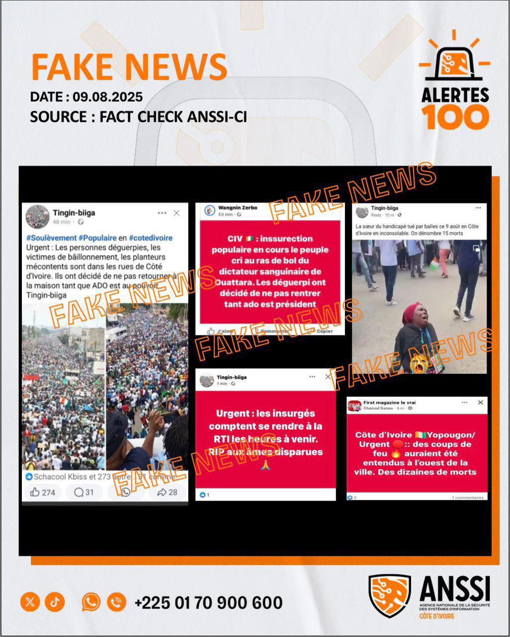 « La marche organisée par le PDCI-RDA et le PPA-CI ce 9 août 2025 a été accompagnée d’une campagne de désinformation. Cette campagne a tenté de dépeindre une situation insurrectionnelle dans le but d’inciter au désordre », a indiqué Alertes 100, relayé par la PLCC et l’ANSSI.