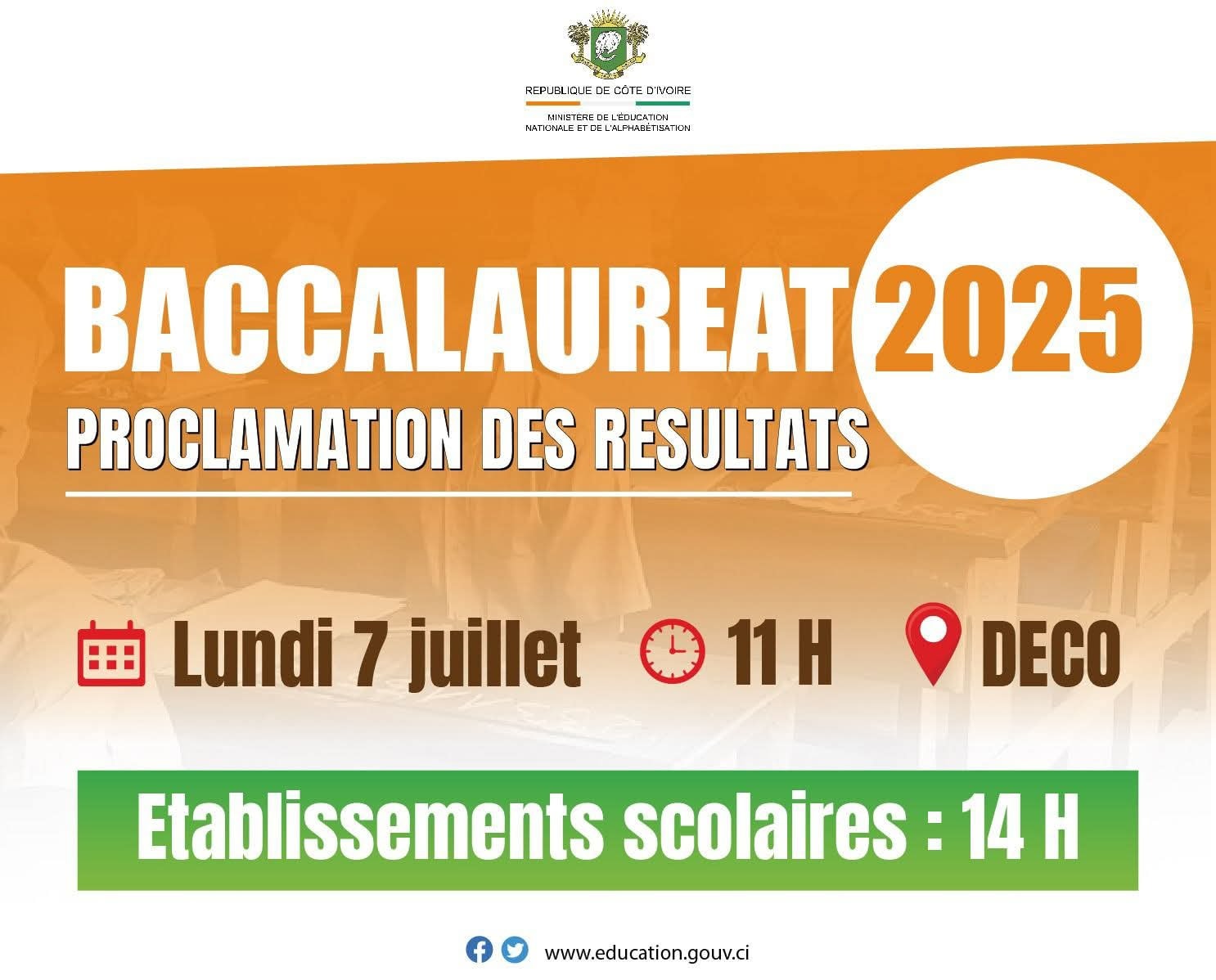 En Côte d’Ivoire, le ministère de l’Éducation nationale et de l’Alphabétisation a confirmé ce dimanche 6 juillet 2025 la date de proclamation des résultats du BAC 2025.