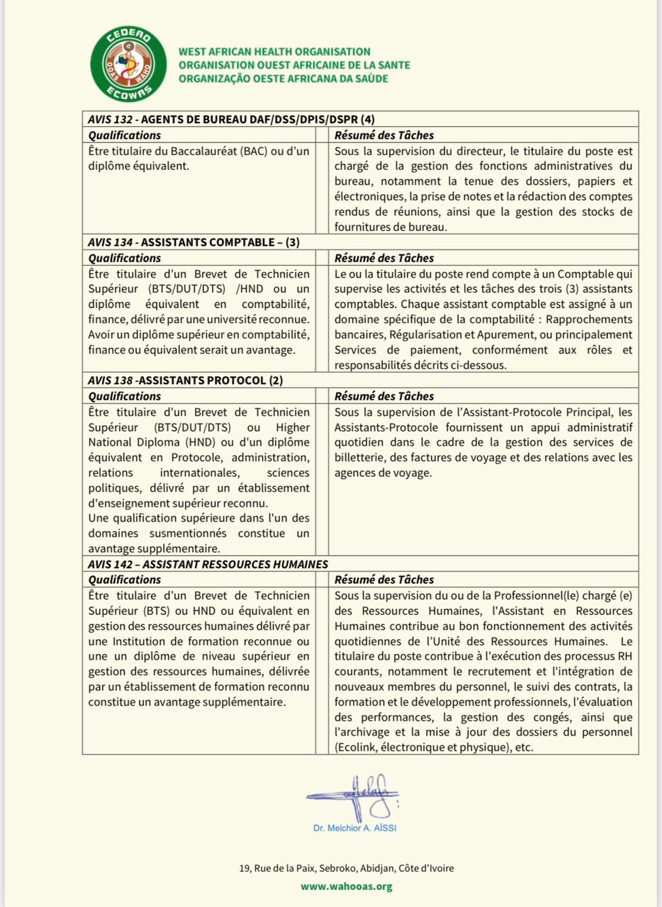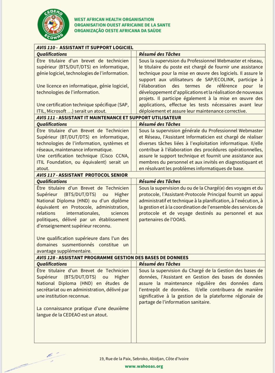 N° N° de poste Nombre Intitulé du poste Email pour postuler 1 101 2 Assistant(e)s administratif(ves) [email protected] 2 102 1 Assistant(e) passation des marchés [email protected] 3 107 5 Chauffeurs [email protected] 4 108 4 Gestionnaires de bureau [email protected] 5 110 1 Assistant IT Support logiciel [email protected] 6 111 1 Assistant IT maintenance et support utilisateur [email protected] 7 117 1 Assistant protocole senior [email protected] 8 128 1 Assistant programme gestion collecte de données [email protected] 9 129 1 Assistant programme analyse sanitaire [email protected] 10 130 1 Gestionnaire de bureau DG [email protected] 11 131 1 Assistant(e) administratif(ve) DG [email protected] 12 132 4 Agents de bureau [email protected] 13 134 3 Assistants comptables [email protected] 14 138 2 Assistants protocole [email protected] 15 142 1 Assistant ressources humaines [email protected]
