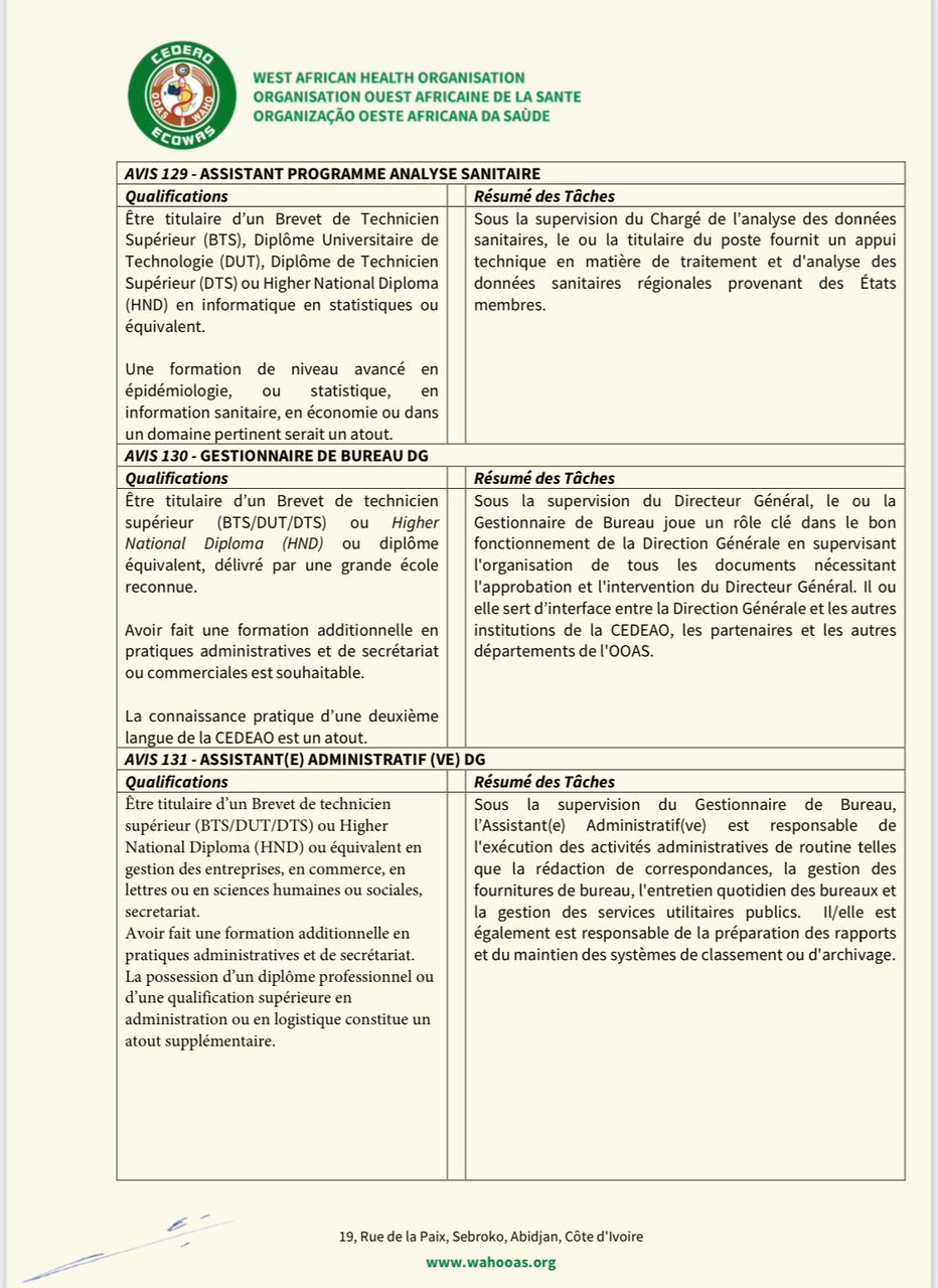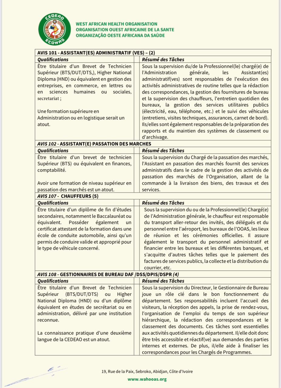 L’OOAS recherche des candidats dûment qualifiés, citoyens de la CEDEAO, pour pourvoir aux postes des services généraux ci-après.