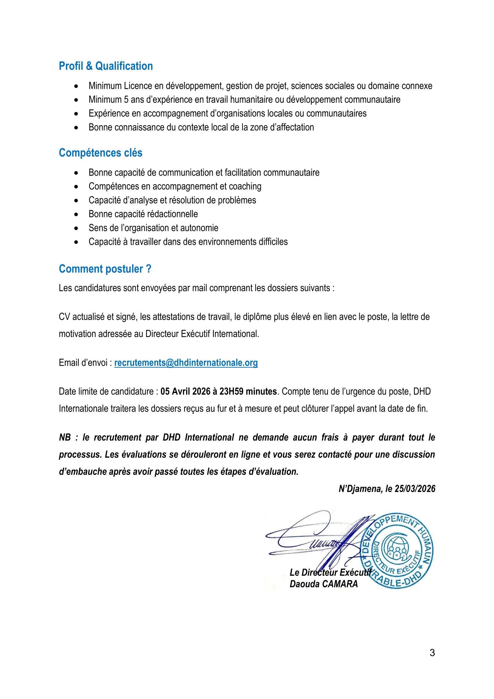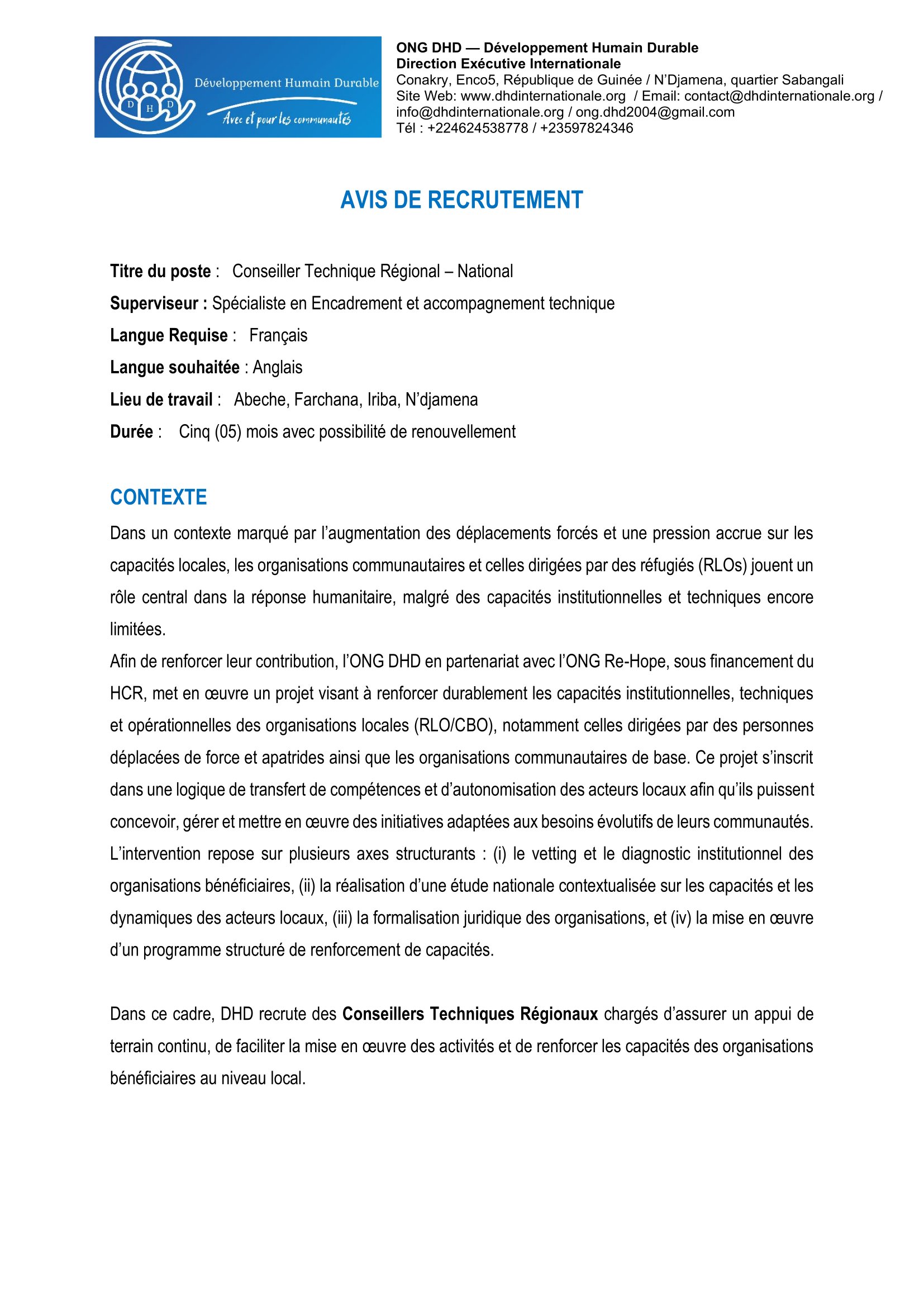 L’ONG Développement Humain Durable recherche des Conseillers Techniques Régionaux, postes basés à Abéché, Farchana, Iriba et N’Djamena.