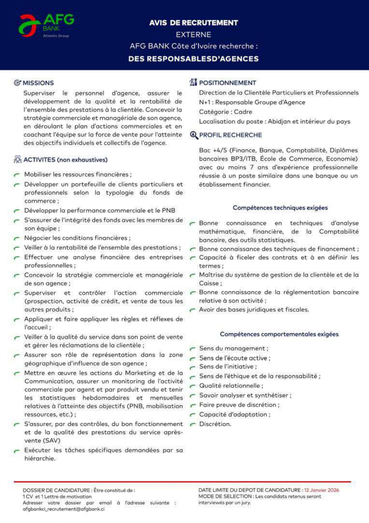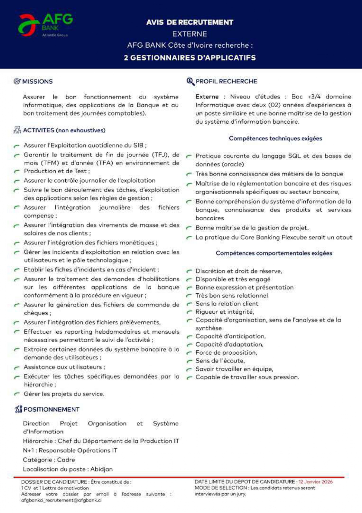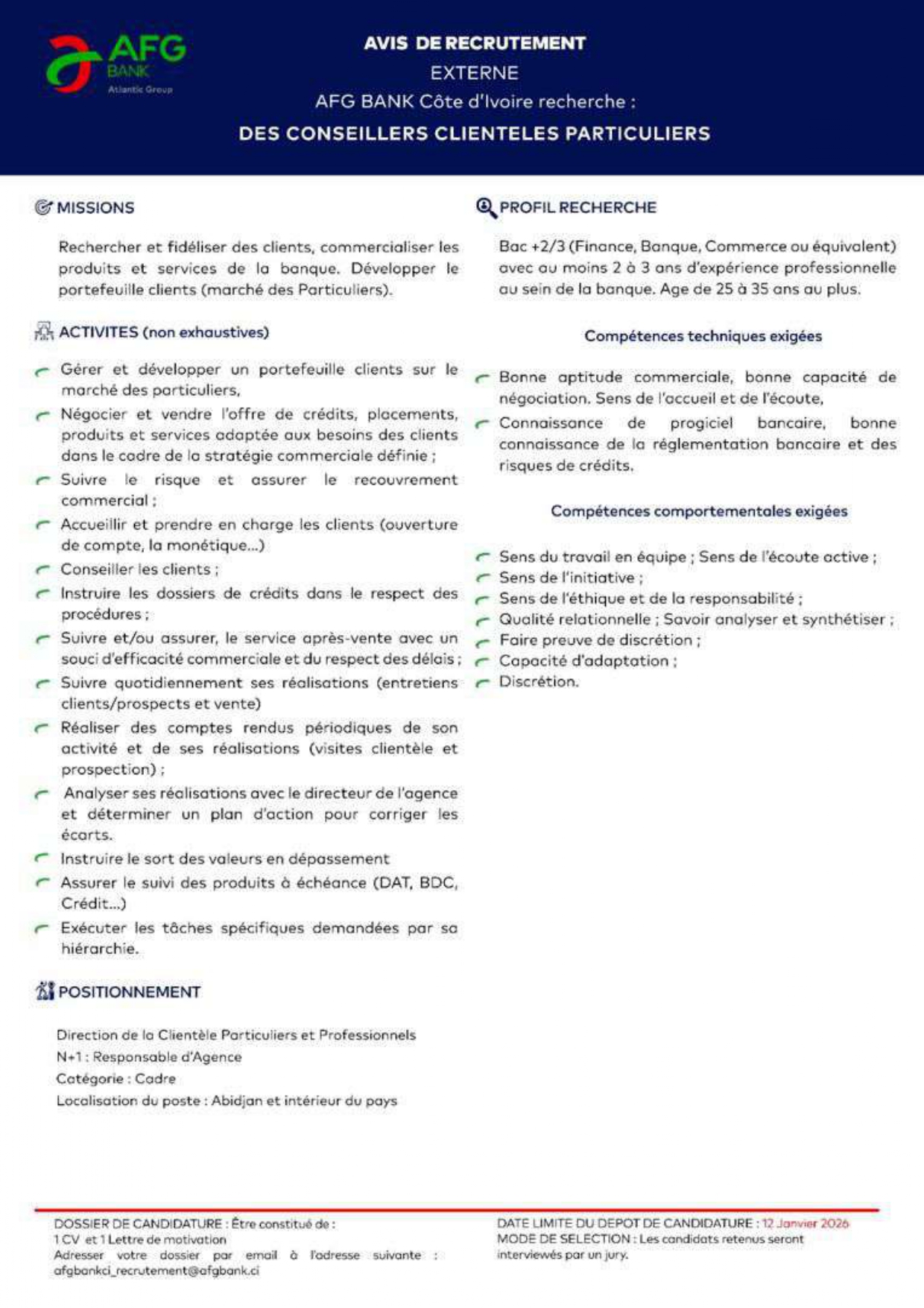Dans le cadre de son développement et du renforcement de ses équipes, AFG Bank ouvre de nouvelles opportunités de carrière pour des talents prêts à relever de nouveaux défis.