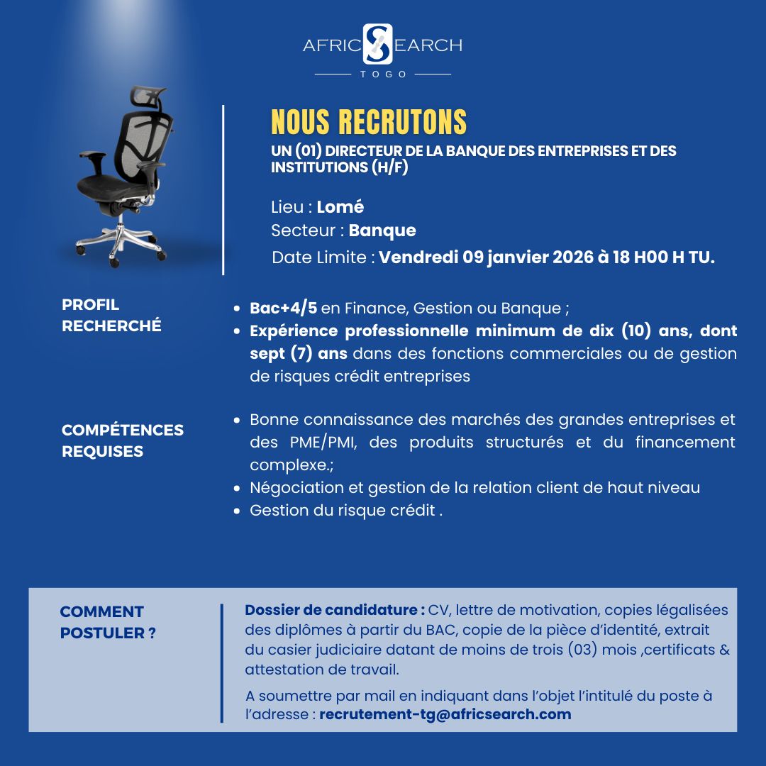 1- Africsearch Togo recrute UN (01) DIRECTEUR DE LA BANQUE DES ENTREPRISES ET DES INSTITUTIONS (H/F)
