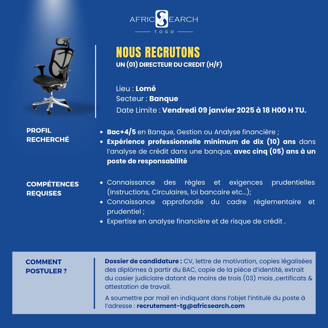 2- Africsearch Togo recrute UN (01) DIRECTEUR DU CREDIT (H/F)