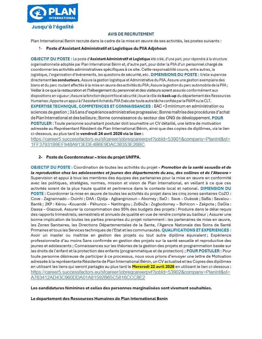 Vous souhaitez mettre votre expertise au service des droits des enfants et de l’égalité pour les filles ? Plan International Bénin lance un appel à candidatures pour deux postes stratégiques dans le cadre de ses activités.