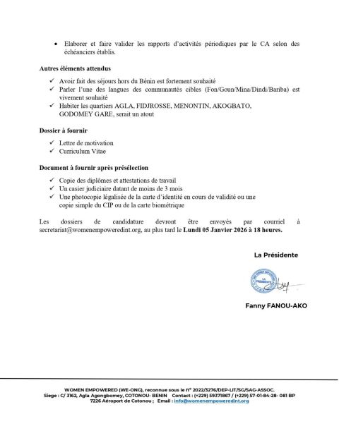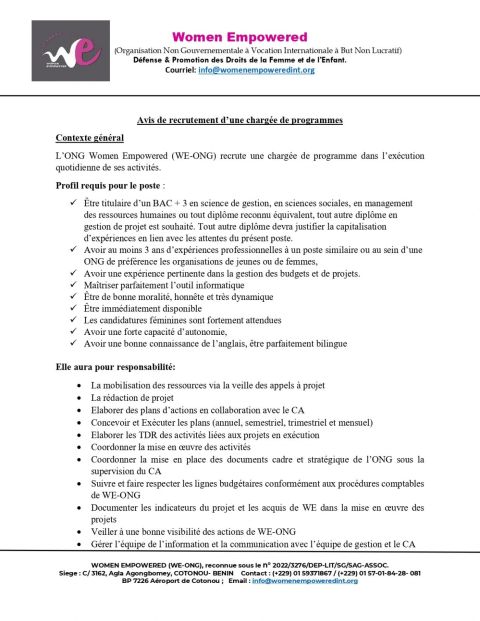 Women Empowered (WE-ONG) recherche un(e) Chargé(e) de Programmes pour coordonner ses actions et porter ses projets vers de nouveaux sommets.