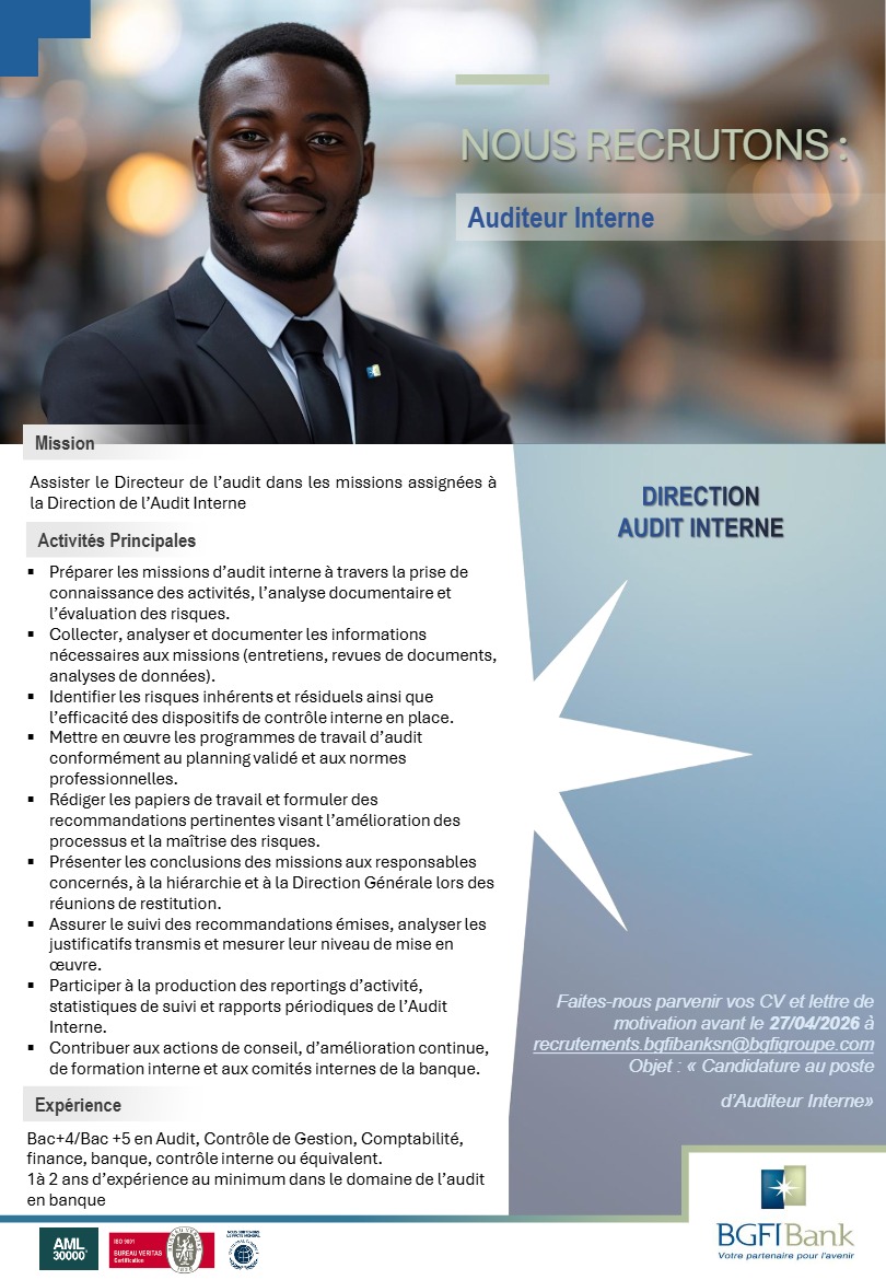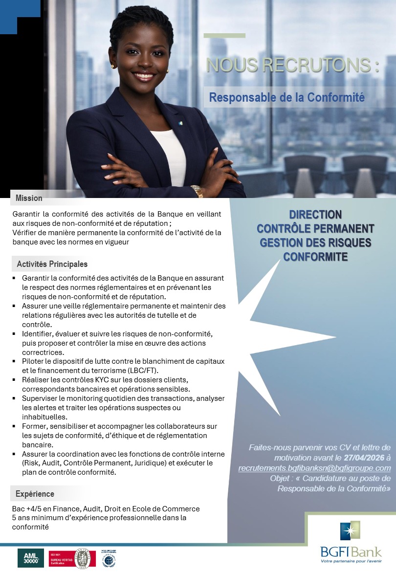 Dans le cadre du renforcement de ses équipes, BGFIBank Sénégal lance un appel à candidature pour les postes de :