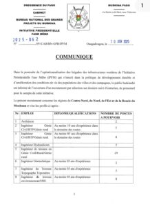 Brigades de construction : L’Initiative Présidentielle » Faso Mêbo » recrute dans les régions du Centre-Nord, du Nord, de l’Est et de la Boucle du Mouhoun .