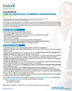 Nous recrutons un 𝐂𝐇𝐄𝐅 𝐃𝐄 𝐃𝐈𝐕𝐈𝐒𝐈𝐎𝐍 𝐃𝐔 𝐂𝐎𝐌𝐌𝐄𝐑𝐂𝐄 𝐈𝐍𝐓𝐄𝐑𝐍𝐀𝐓𝐈𝐎𝐍𝐀𝐋 avec pour responsabilité d’identifier et de développer des opportunités en Trade Finance couvrant à la fois les produits traditionnels et les solutions structurées afin de positionner Ecobank Congo comme un acteur de référence.