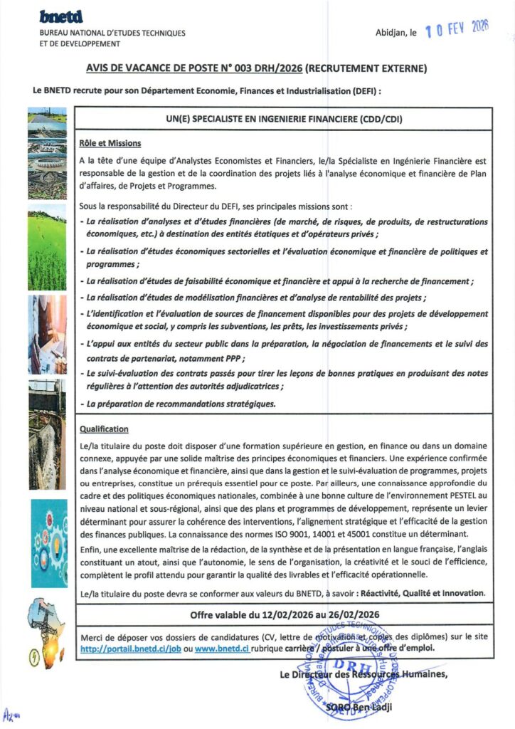 Merci de déposer vos dossiers de candidatures (CV, lettre de motivation et copies des diplômes) sur le site ou http://portail.bnetd.ci/job ou www.bnetd.ci rubrique carrière/ postuler à une offre d’emploi.