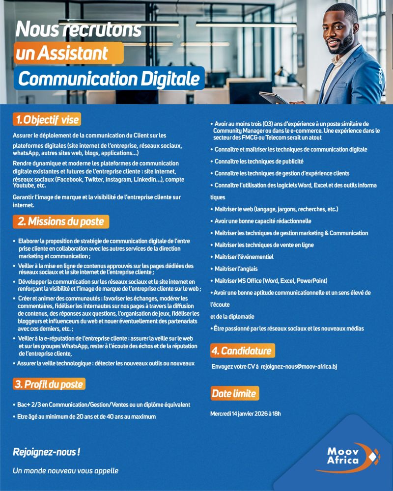 Emploi : Moov Africa Bénin, filiale du Groupe Maroc Télécom, est une entreprise de télécommunication, qui propose et déploie une palette unique de services alliant des offres et des solutions sur-mesure : Téléphonie mobile, Internet, équipements internet et des objets connectés.