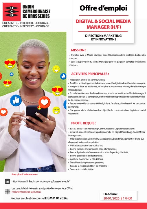 50 ans au service du peuple , au service de l’excellence à travers des marques exceptionnelles, la Société UCB, filiale du Groupe KADJI, recrute un(e) Digital & Social Media Manager en CDI.