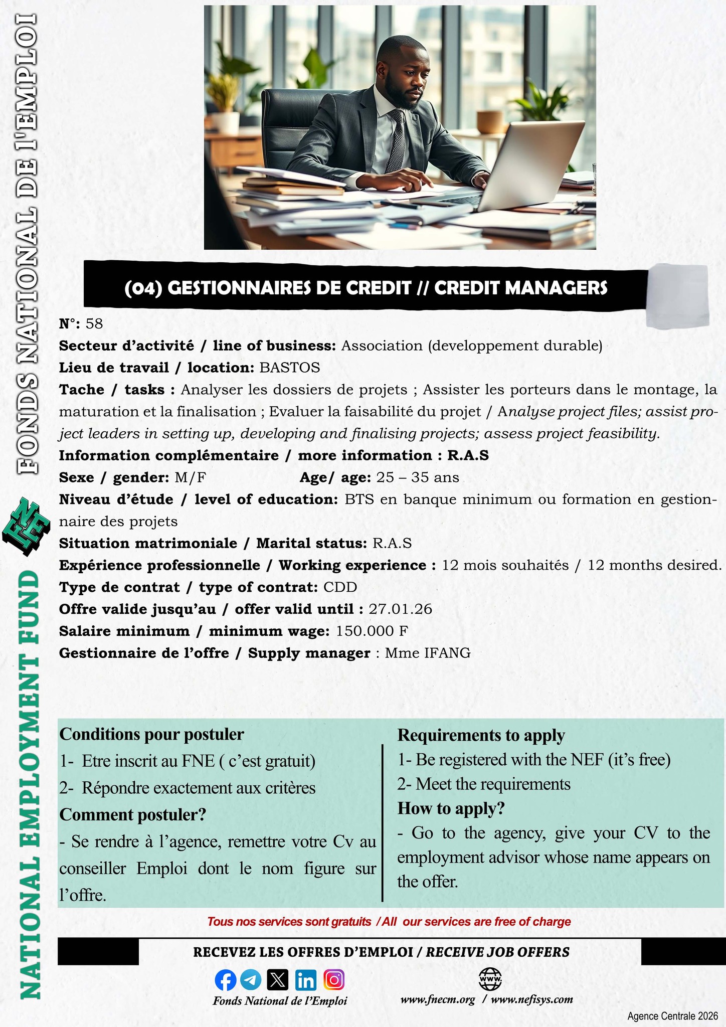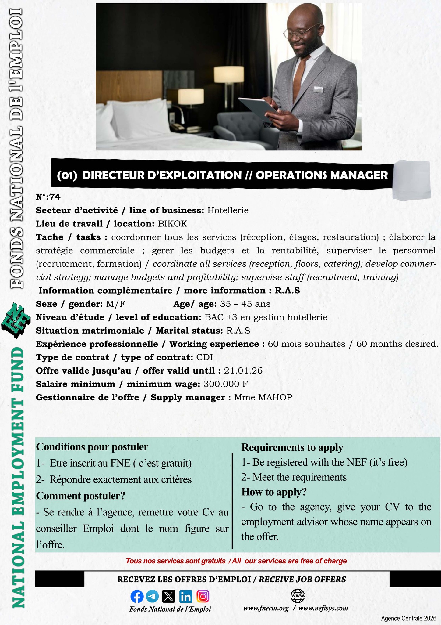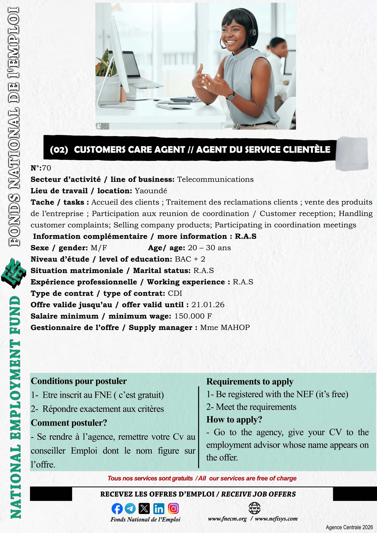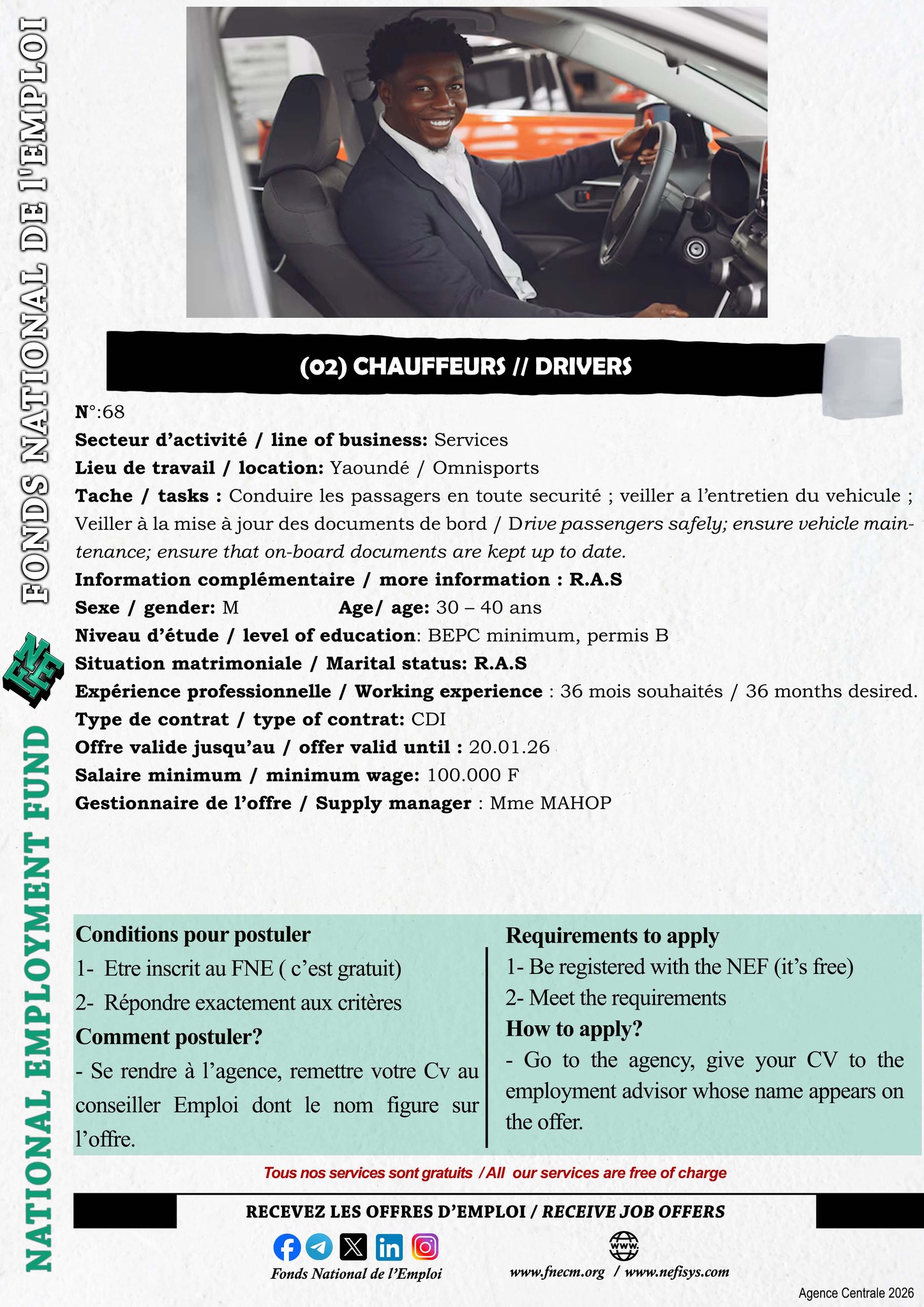 Le Fonds National de l’Emploi (FNE) est chargé de la mise en œuvre de la politique du Gouvernement en matière de promotion de l’emploi, de l’auto-emploi et de l’insertion des demandeurs d’emploi.