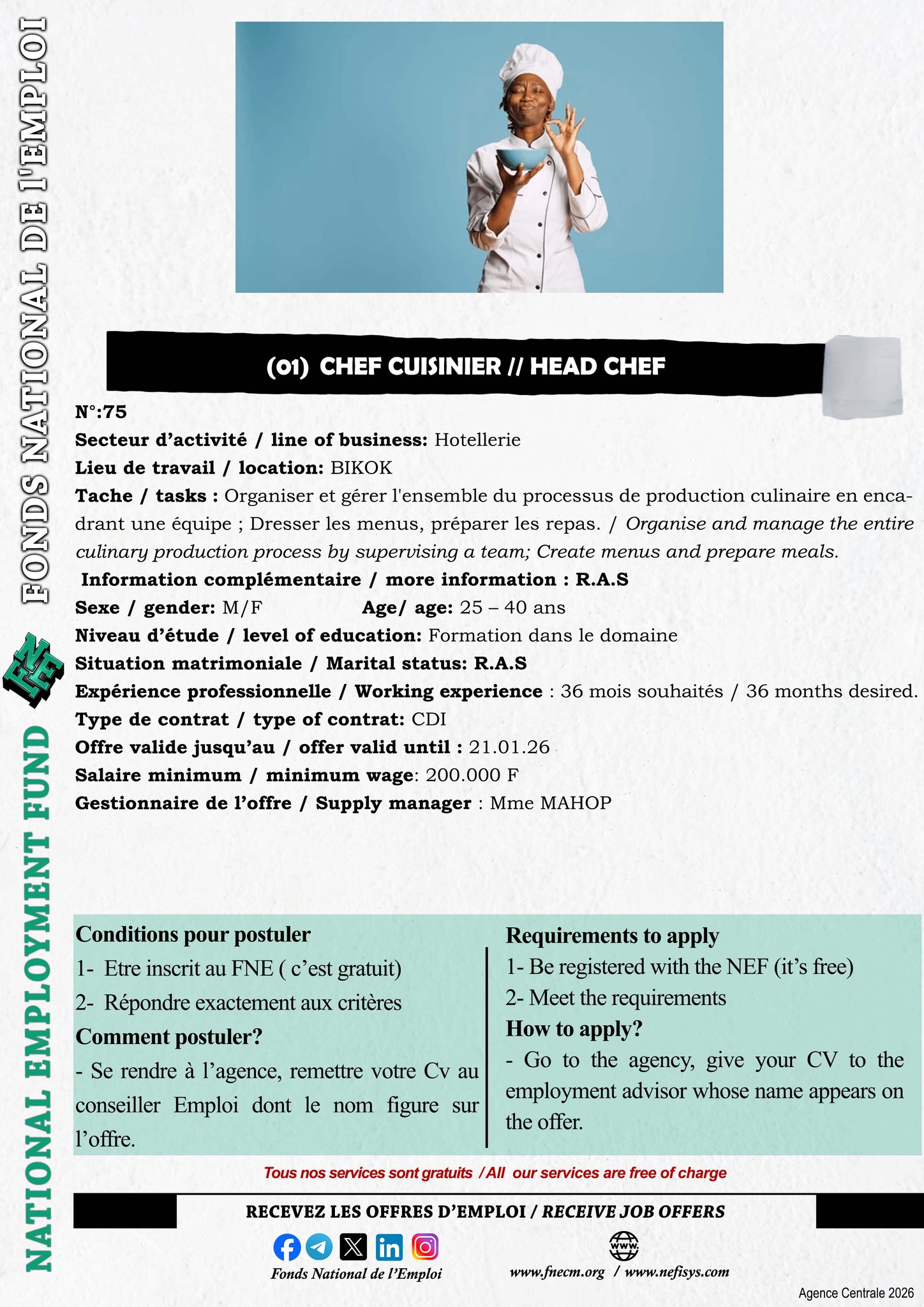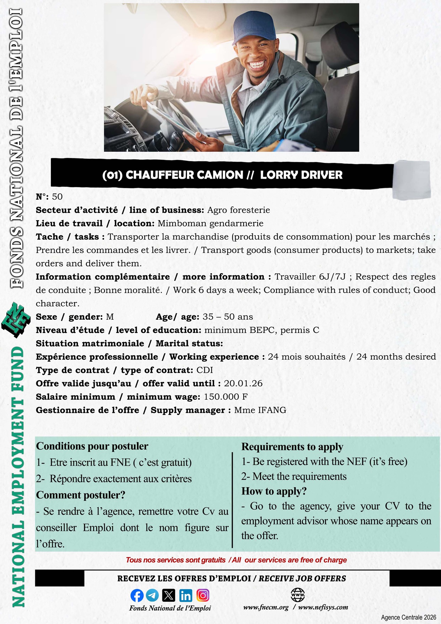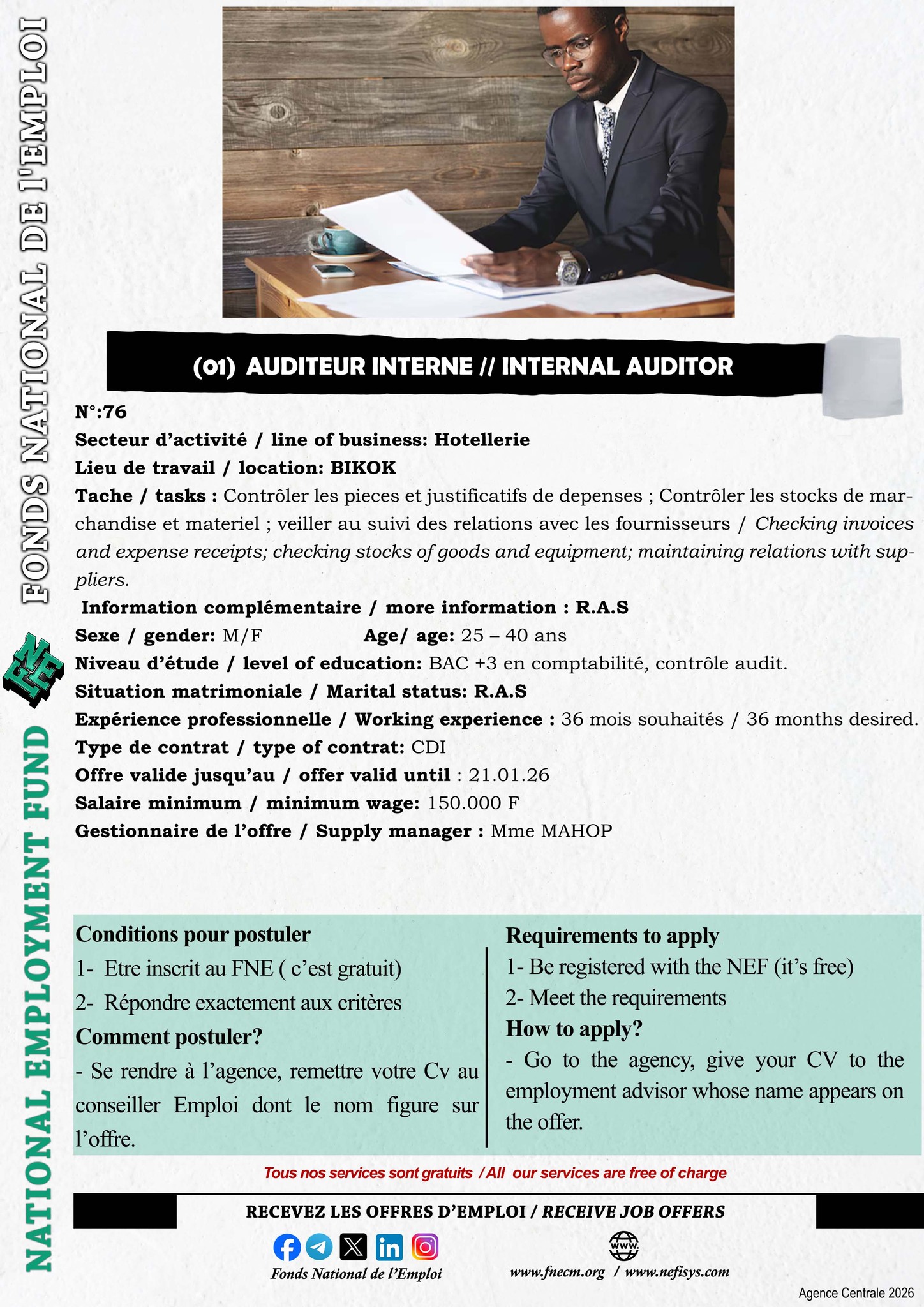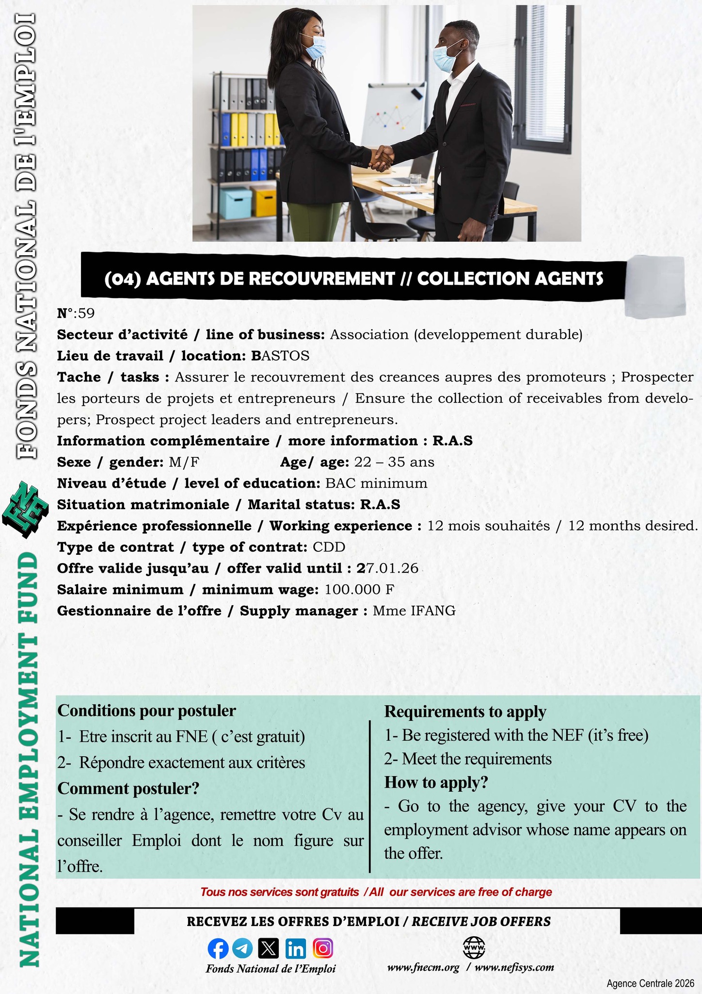 Le Fonds National de l’Emploi (FNE) est chargé de la mise en œuvre de la politique du Gouvernement en matière de promotion de l’emploi, de l’auto-emploi et de l’insertion des demandeurs d’emploi.