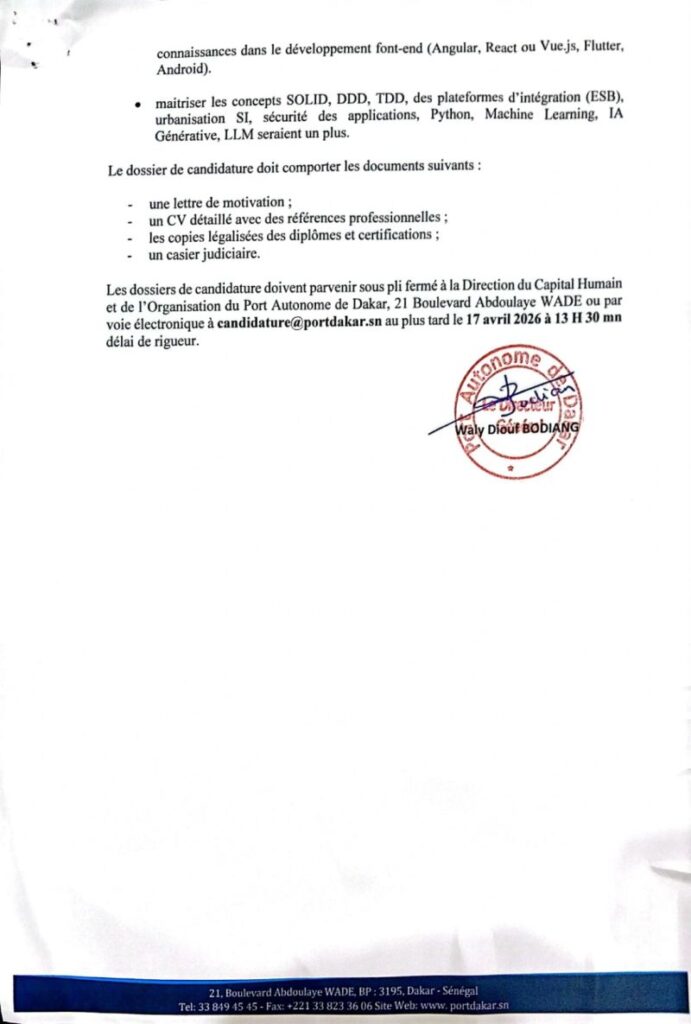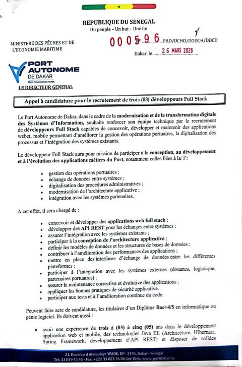 Dans le cadre de la modernisation et de la transformation digitale des systèmes d’information, le Port Autonome de Dakar lance un appel à candidature pour le recrutement de trois développeurs Full Stack.