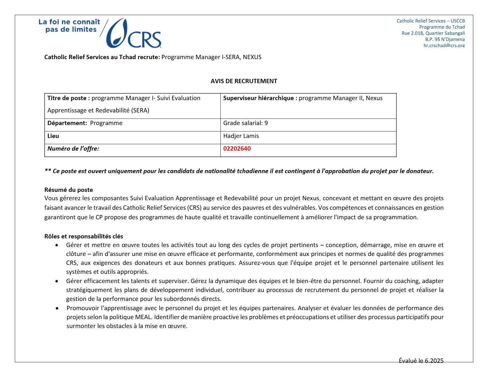 Poste : Programme Manager I- Suivi Evaluation Apprentissage et Redevabilité (SERA)