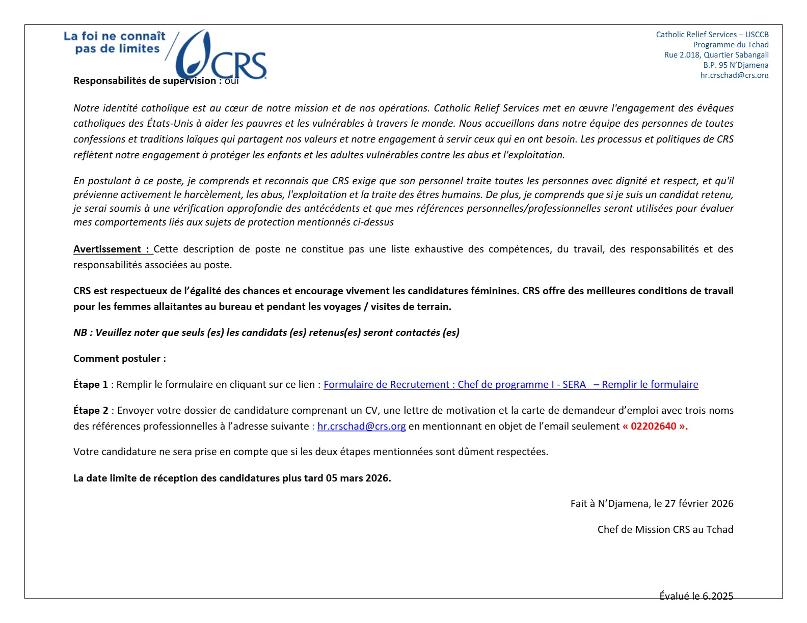 Ce poste est ouvert uniquement pour les candidats de nationalité tchadienne il est contingent à l’approbation du projet par le donateur.