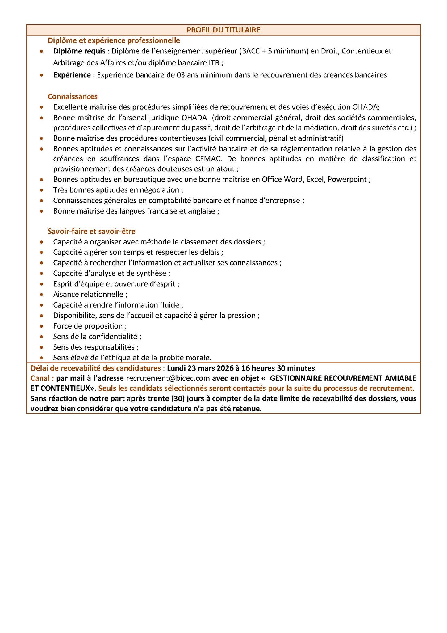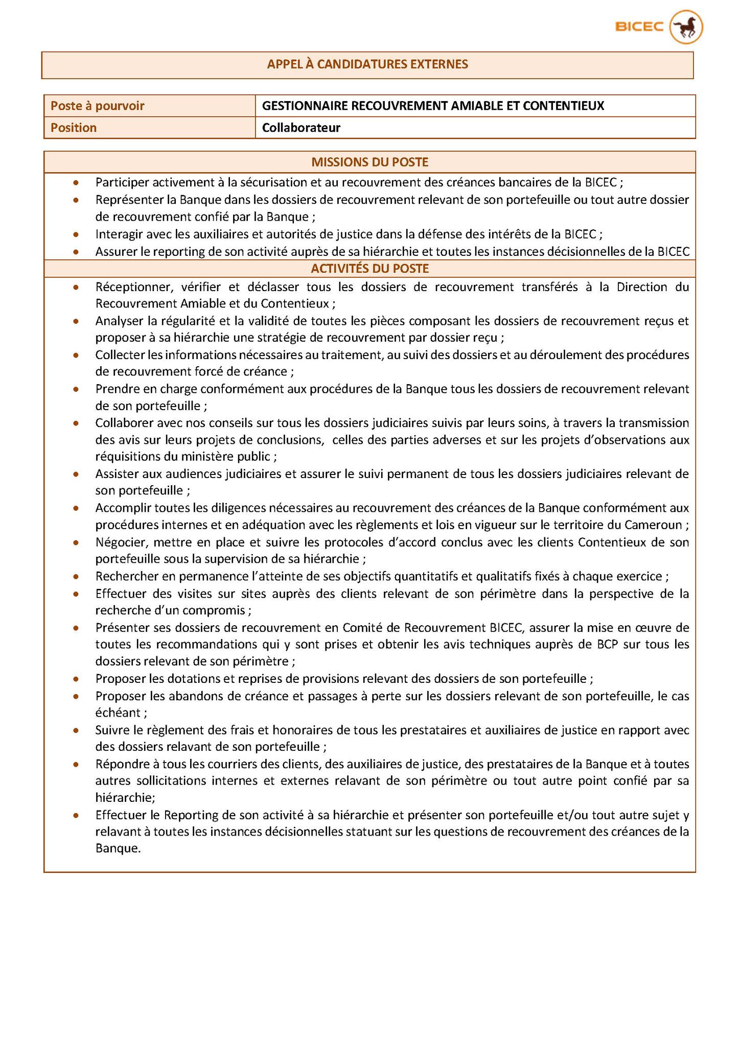 Dans le cadre du renforcement de ses équipes, la BICEC lance un appel à candidatures pour le poste de Gestionnaire Recouvrement Amiable et Contentieux, rattaché à la Direction Recouvrement Amiable et Contentieux.