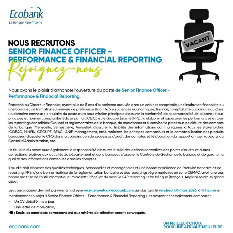 Ce poste vous intéresse? Veuillez soumettre votre candidature à l’adresse 𝐫𝐞𝐜𝐫𝐮𝐭𝐞𝐦𝐞𝐧𝐭𝐜𝐠@𝐞𝐜𝐨𝐛𝐚𝐧𝐤.𝐜𝐨𝐦 au plus tard 𝐥𝐞 𝐯𝐞𝐧𝐝𝐫𝐞𝐝𝐢 𝟎𝟔 𝐦𝐚𝐫𝐬 𝟐𝟎𝟐𝟔 à 𝟏𝟕 𝐡𝐞𝐮𝐫𝐞𝐬 en mentionnant en objet « Senior Finance Officer – Performance & Financial Reporting». Votre dossier de candidature devra comporter nécessairement :