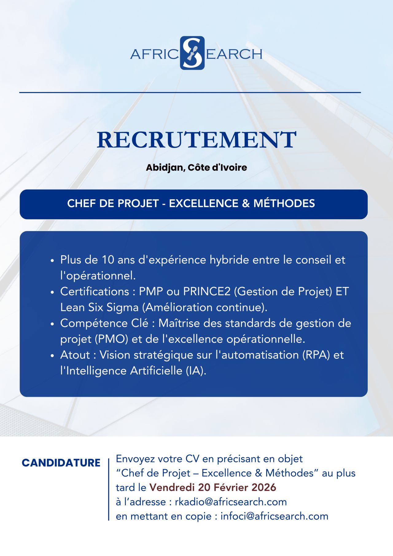 Pour postuler : Envoyez votre CV à [email protected] avec l’objet « Chef de Projet – Excellence & Méthodes ». Mettre [email protected] en copie.