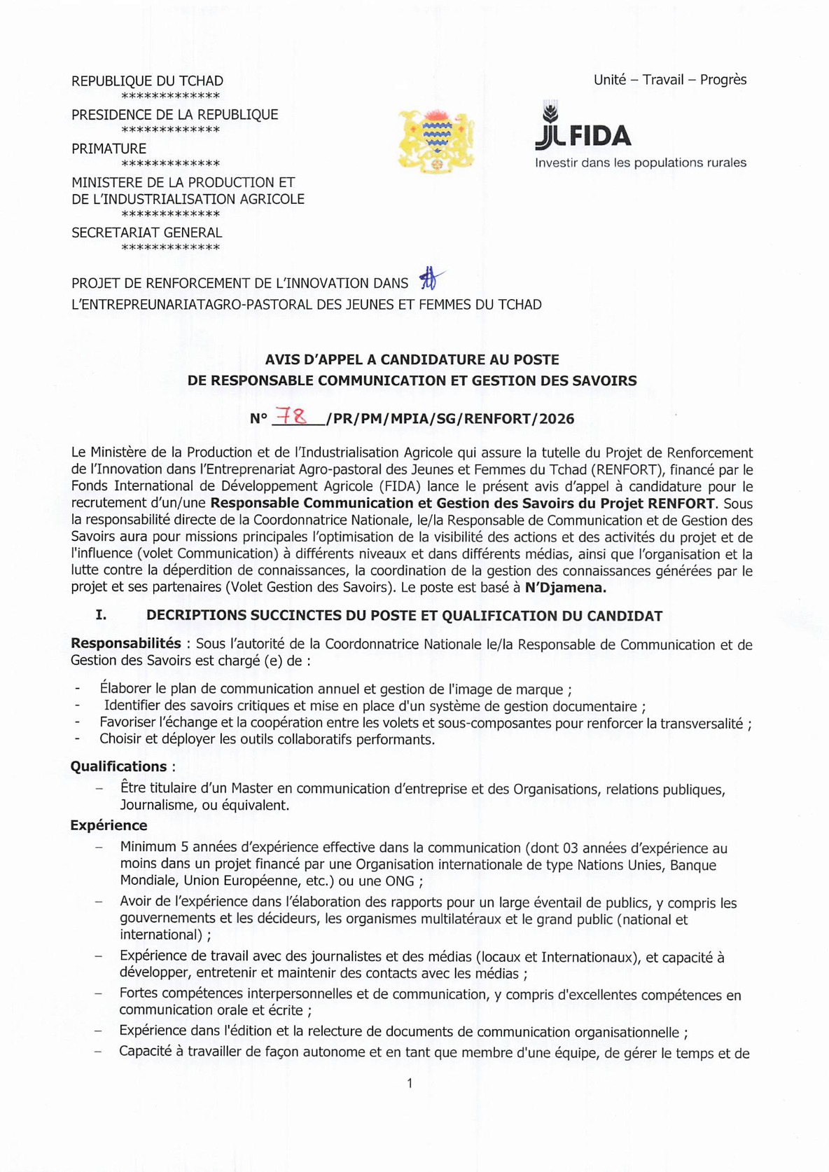 Le Fonds International de Développement Agricole (FIDA) recrute un Responsable Communication et Gestion des Savoirs.