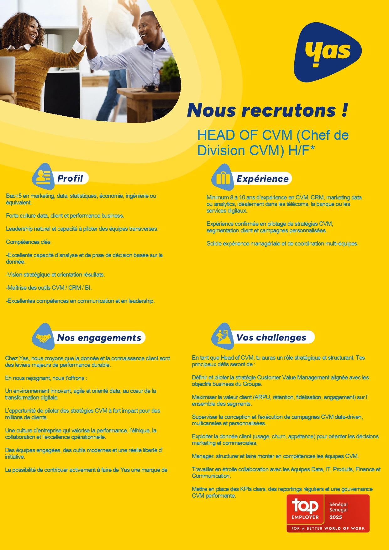 Yas Sénégal recrute un HEAD OF CVM (Chef de Division CVM) H/F*