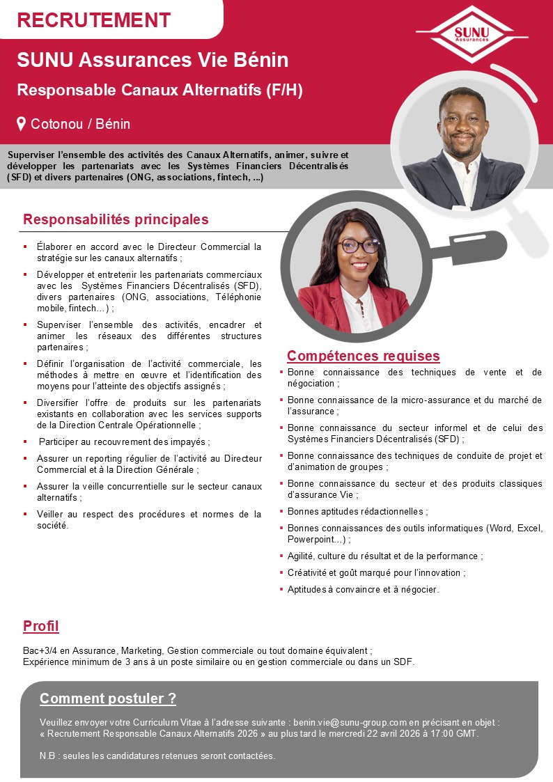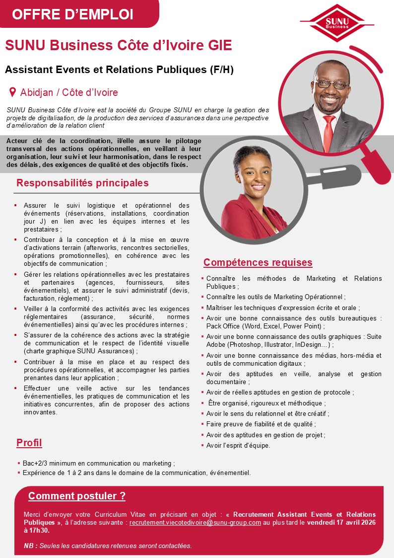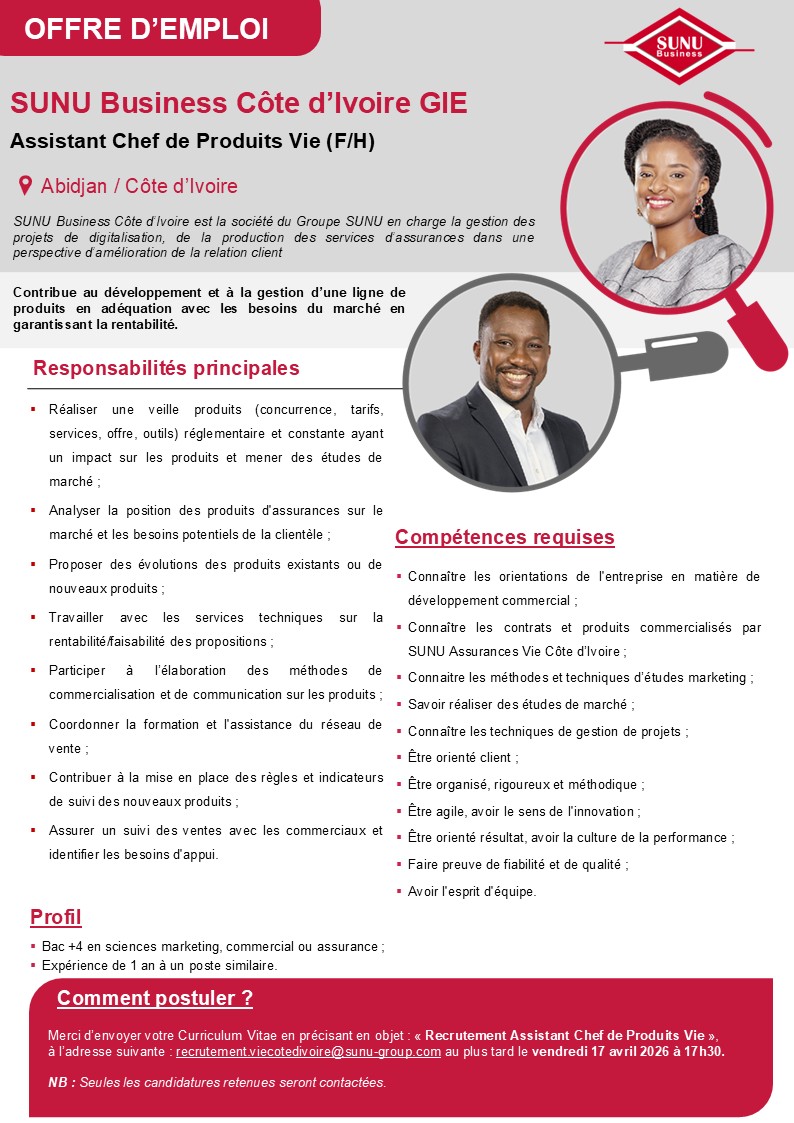 Les filiales du Groupe SUNU recrutent ! Ci-dessous les détails de l’offre.