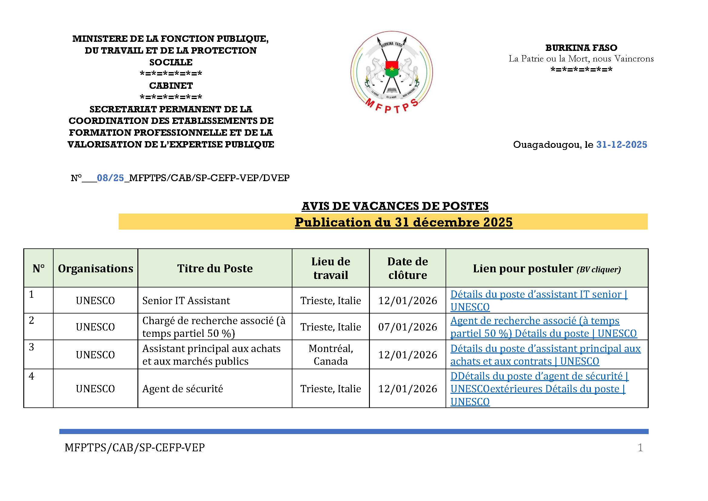 Au Burkina Faso, le gouvernement a publié une liste d’une vingtaine de vacances de postes à l’UNESCO. Les voici :
