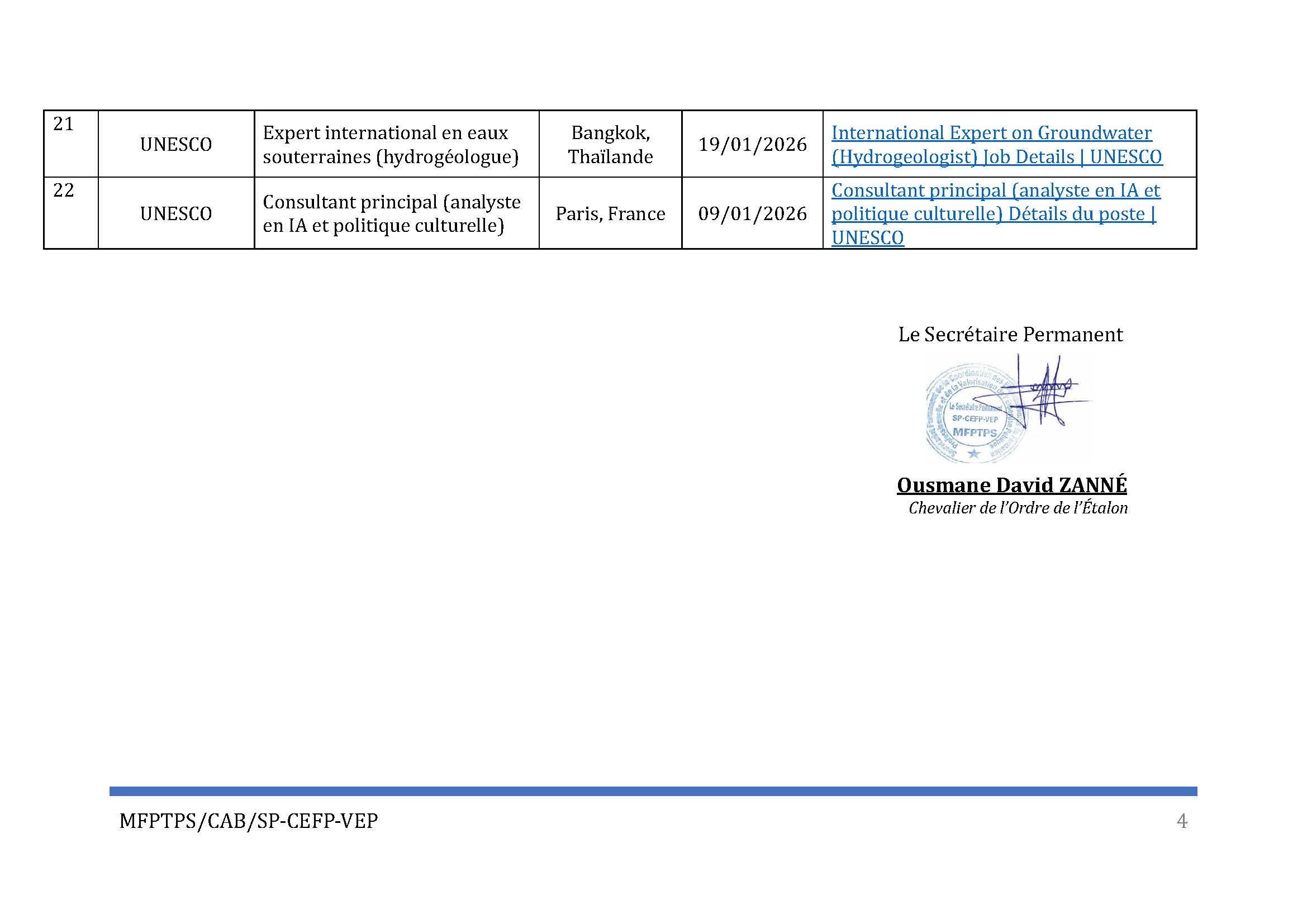 | 21 | UNESCO | Expert international en eaux souterraines (hydroge ologue) | Bangkok, Thaï lande | 19/01/2026 | International Expert on Groundwater (Hydrogeologist) Job Details | UNESCO |
