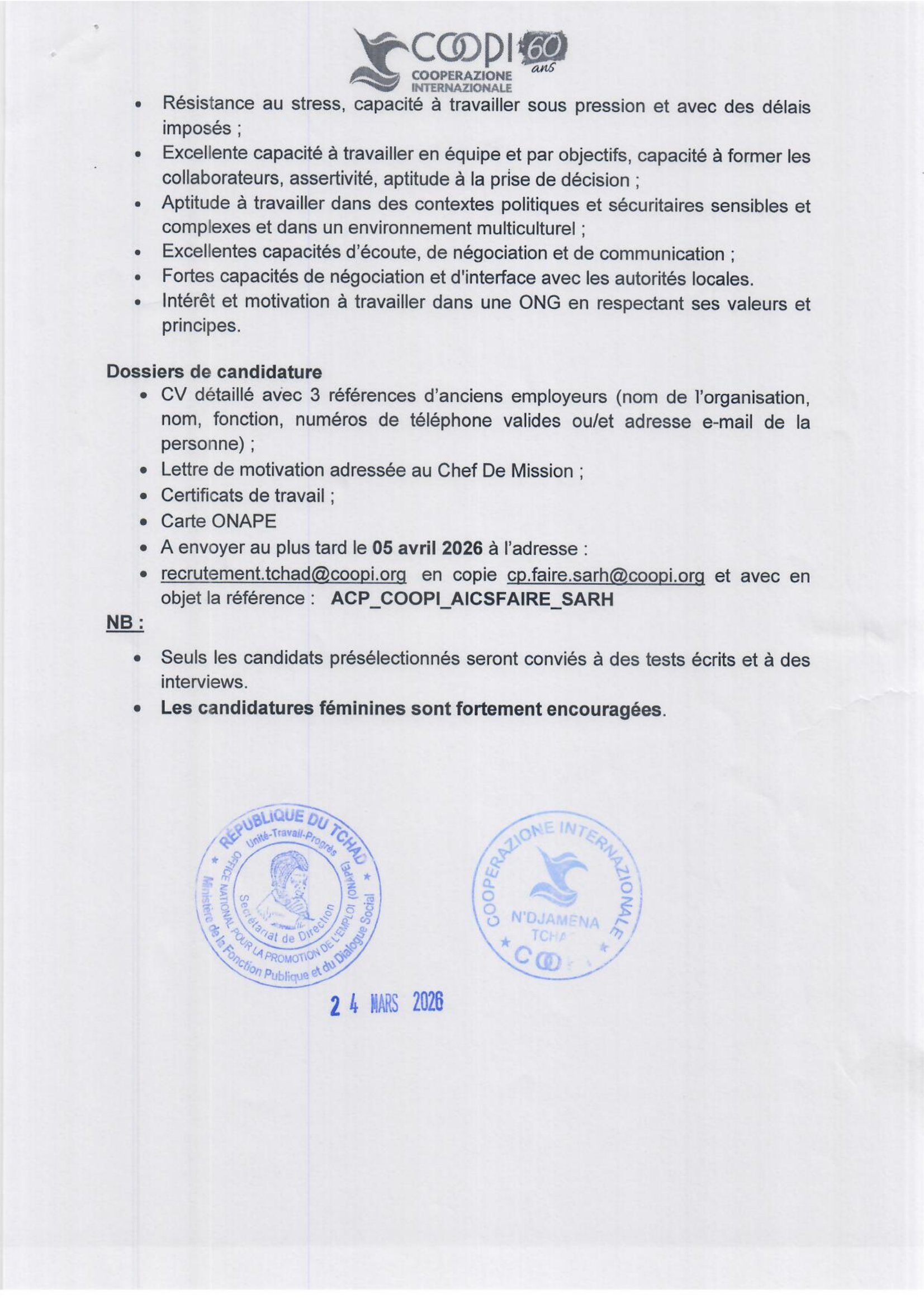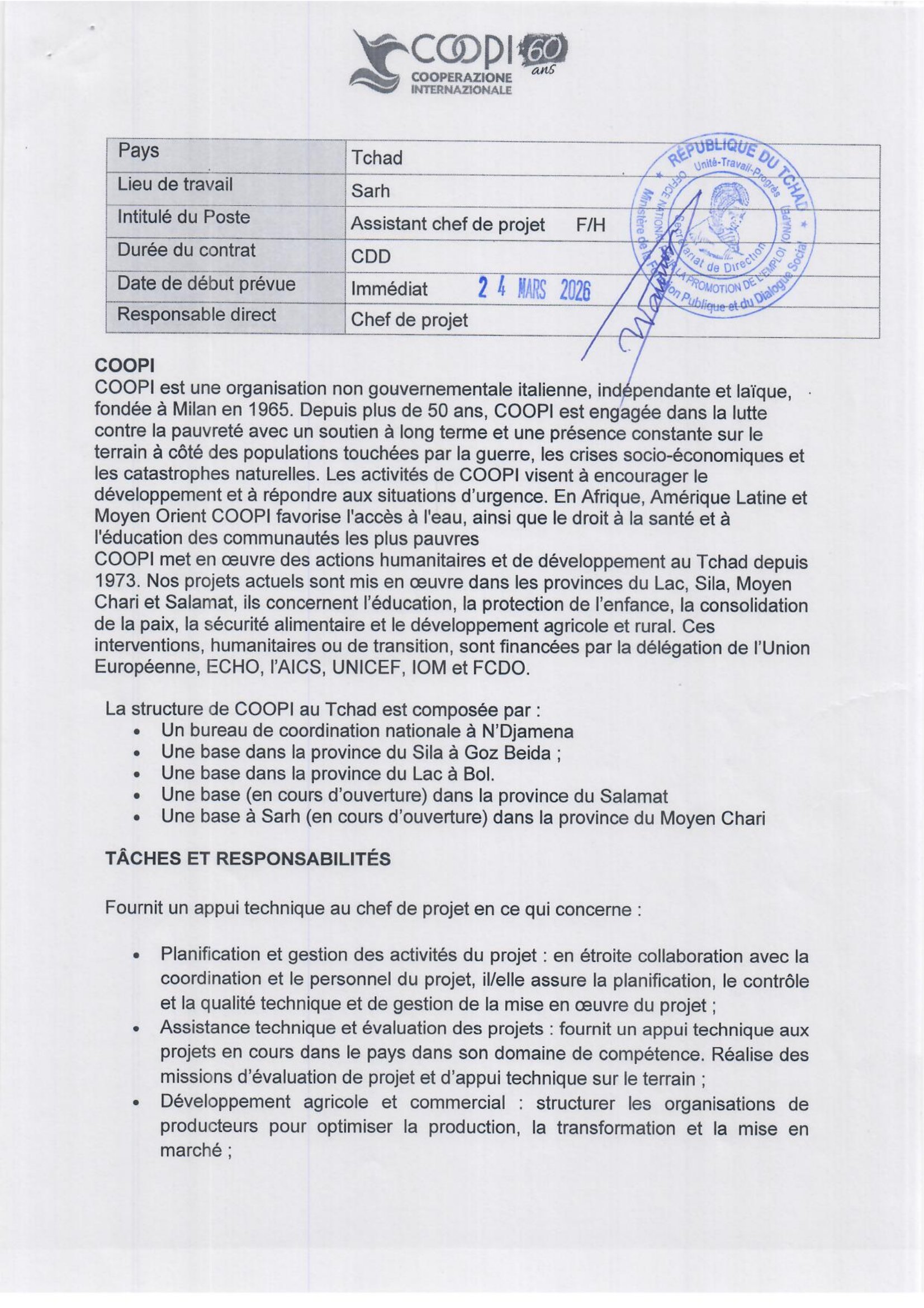 Dans ce cadre, l’ONG Humanitaire COOPI International recrute une assistante Chef de Projet à Sarh, Tchad.