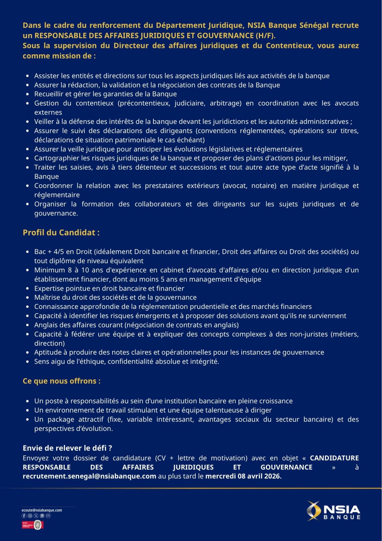 Le Responsable des Affaires Juridiques et Gouvernance aura pour mission de sécuriser les activités de la banque, d’accompagner les différentes directions dans leurs décisions et de veiller au respect du cadre réglementaire, tout en anticipant ses évolutions.