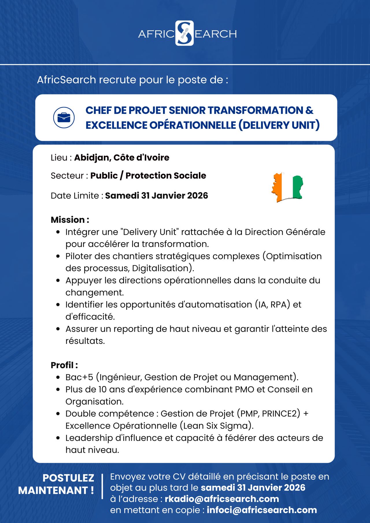 AfricSearch accompagne une Institution Publique majeure du secteur de la Protection Sociale, engagée dans une transformation ambitieuse à fort impact national, pour le recrutement d’un Chef de Projet Senior.