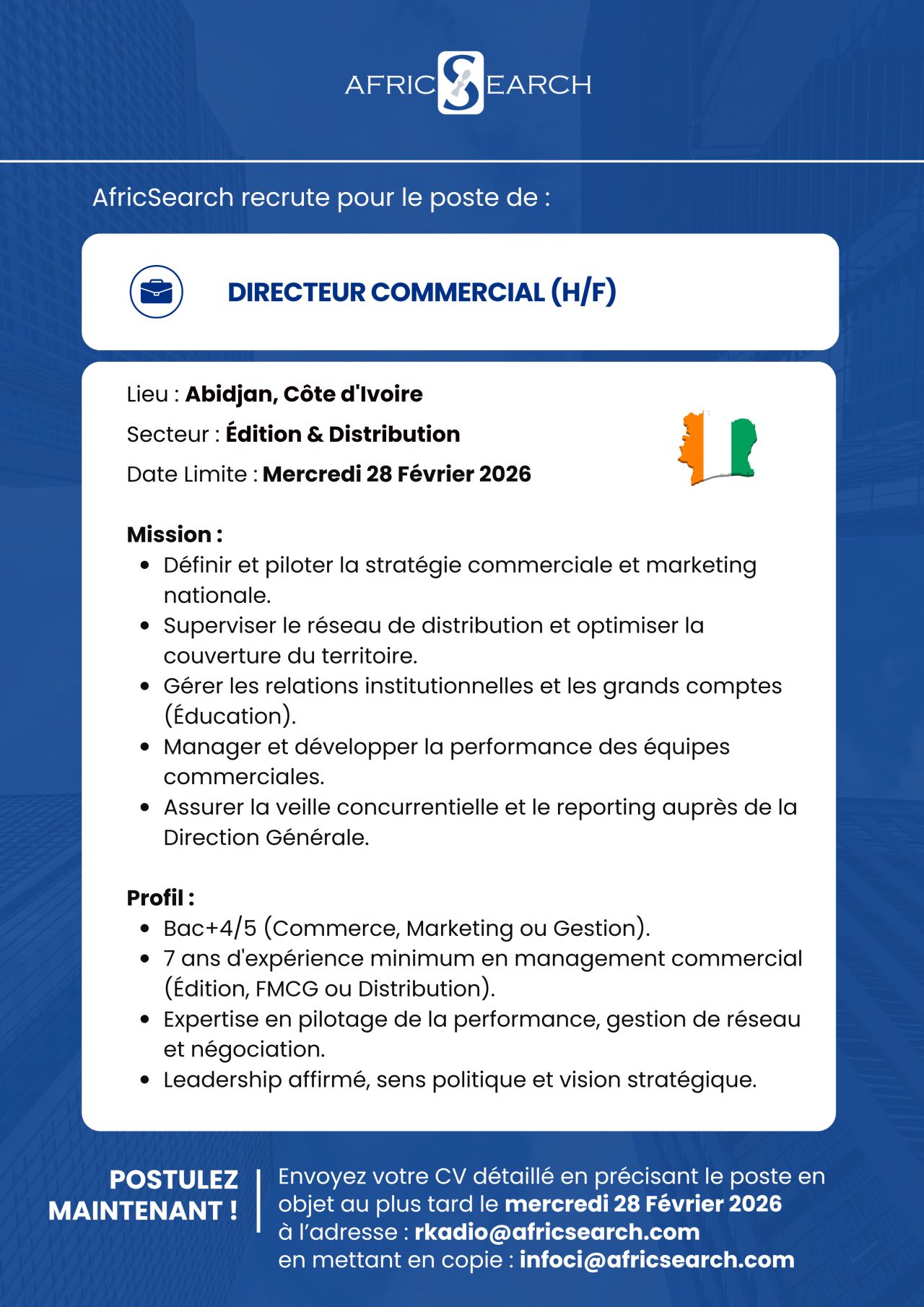 AfricSearch accompagne un acteur majeur de l’édition et de la distribution en Côte d’Ivoire dans le recrutement de son Directeur Commercial.