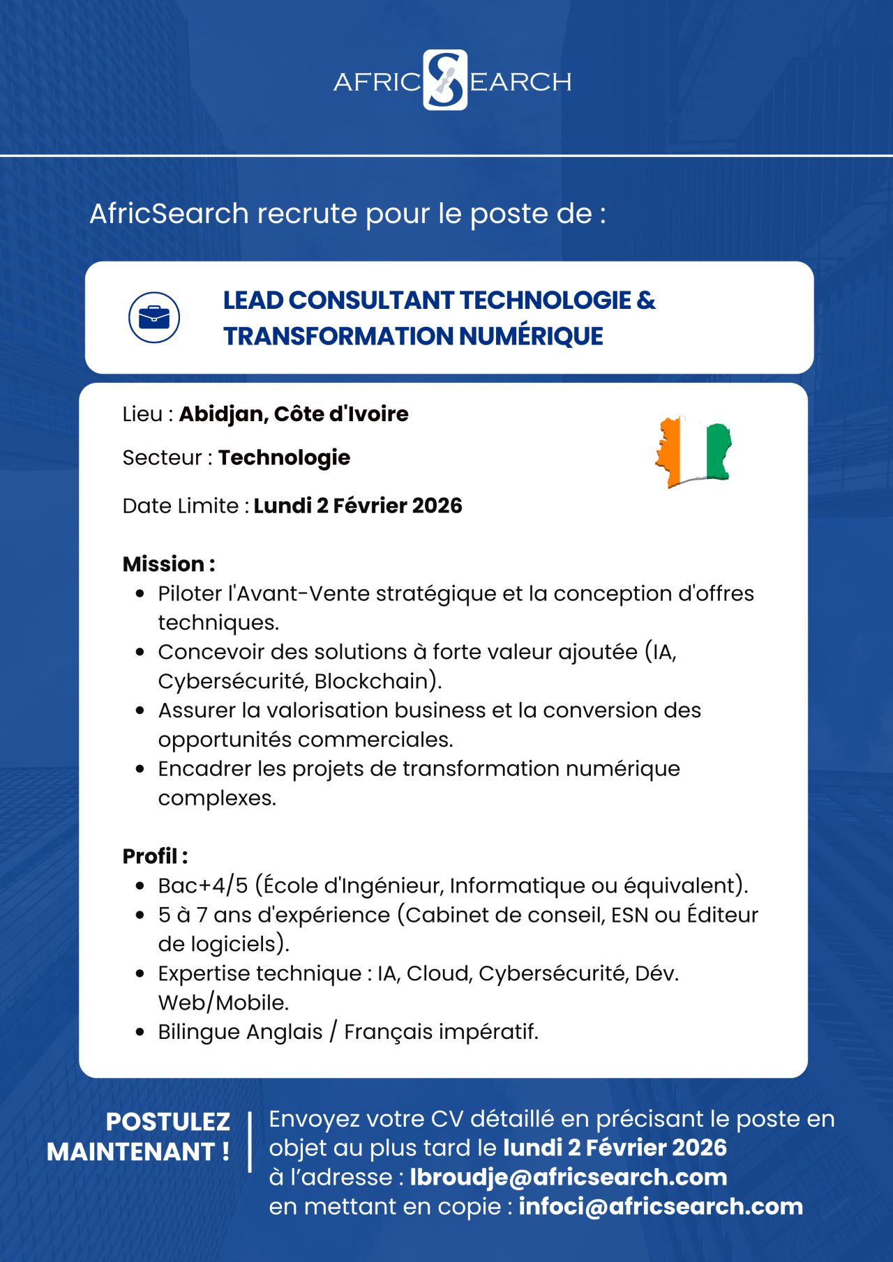 AfricSearch accompagne une entreprise technologique panafricaine de premier plan (Spécialisée IA, Cybersécurité & Blockchain) dans le recrutement de ce poste stratégique : Lead Consultant – Technologie & Transformation Numérique