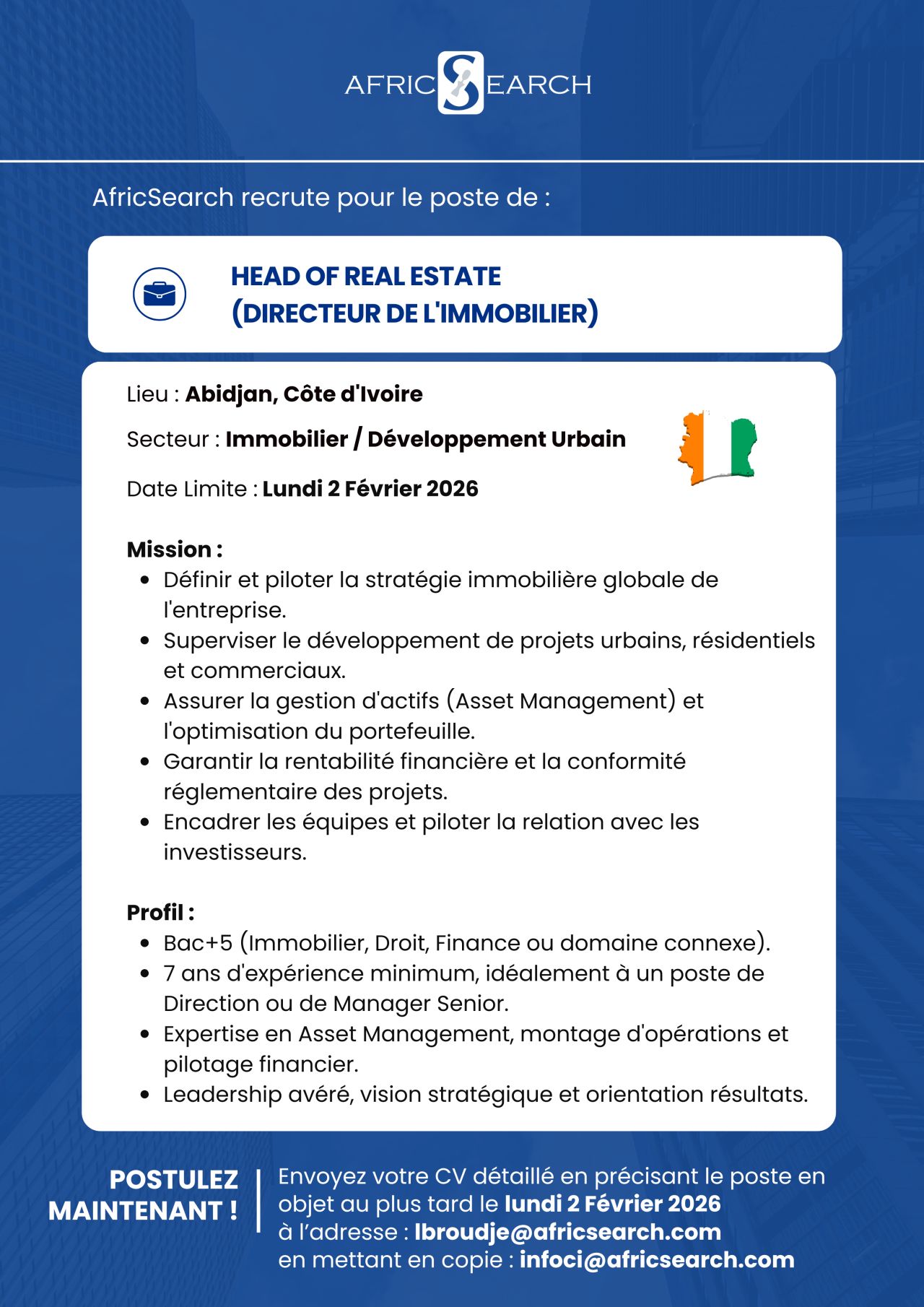 AfricSearch accompagne un acteur majeur du développement immobilier en Côte d’Ivoire, reconnu pour son approche innovante, durable et centrée sur l’inclusion sociale, dans le recrutement de son futur Directeur de l’Immobilier.