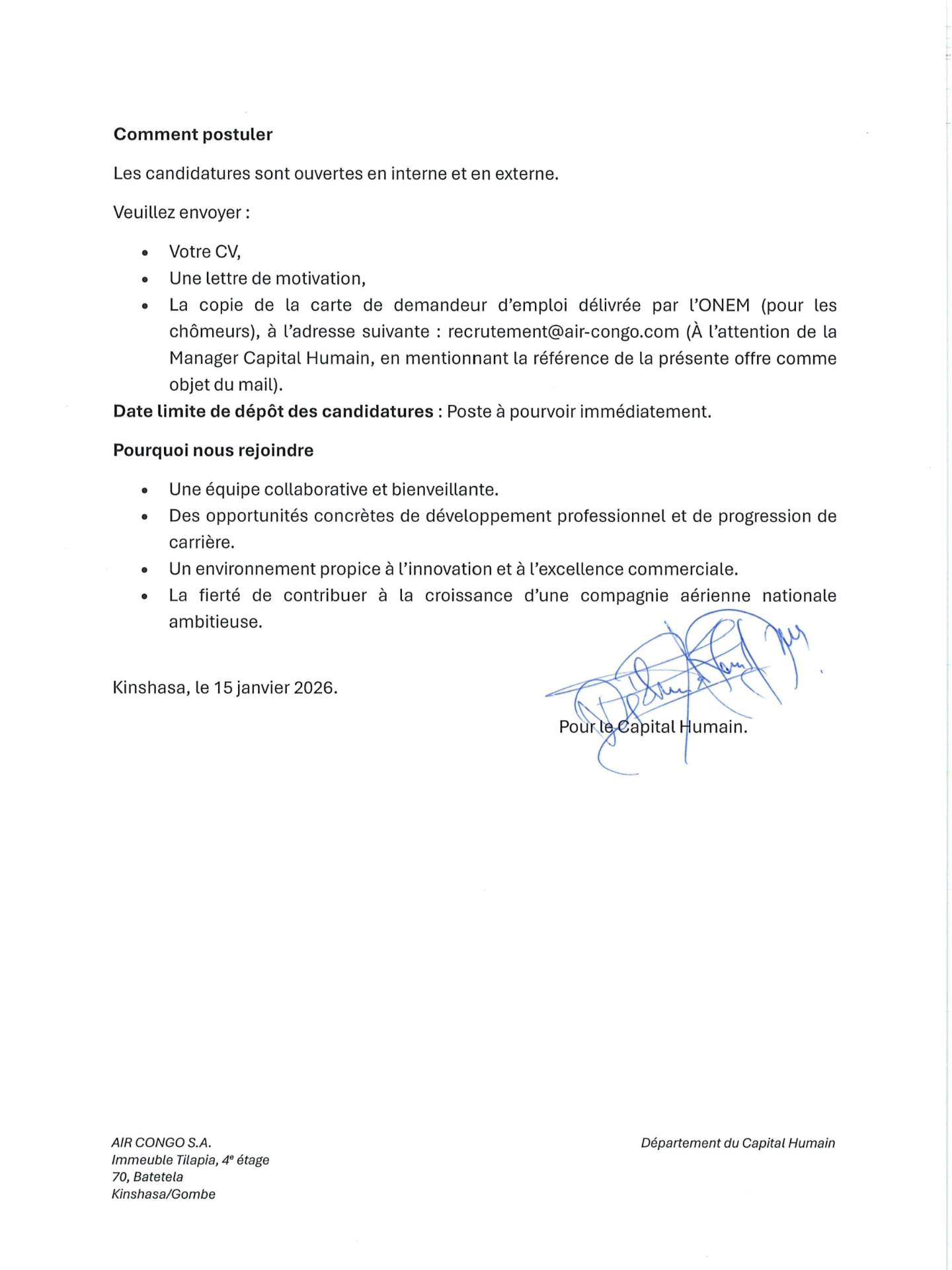 Chez Air Congo, nous croyons que nos employés sont au cœur de notre succès. Nous sommes toujours à la recherche de personnes talentueuses, passionnées et prêtes à contribuer à notre mission de connecter les communautés et de promouvoir le commerce et le tourisme.