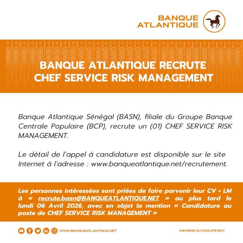 Banque Atlantique Sénégal, filiale du groupe Banque Centrale Populaire (Maroc), recrute un (01) CHEF SERVICE RISK MANAGEMENT.