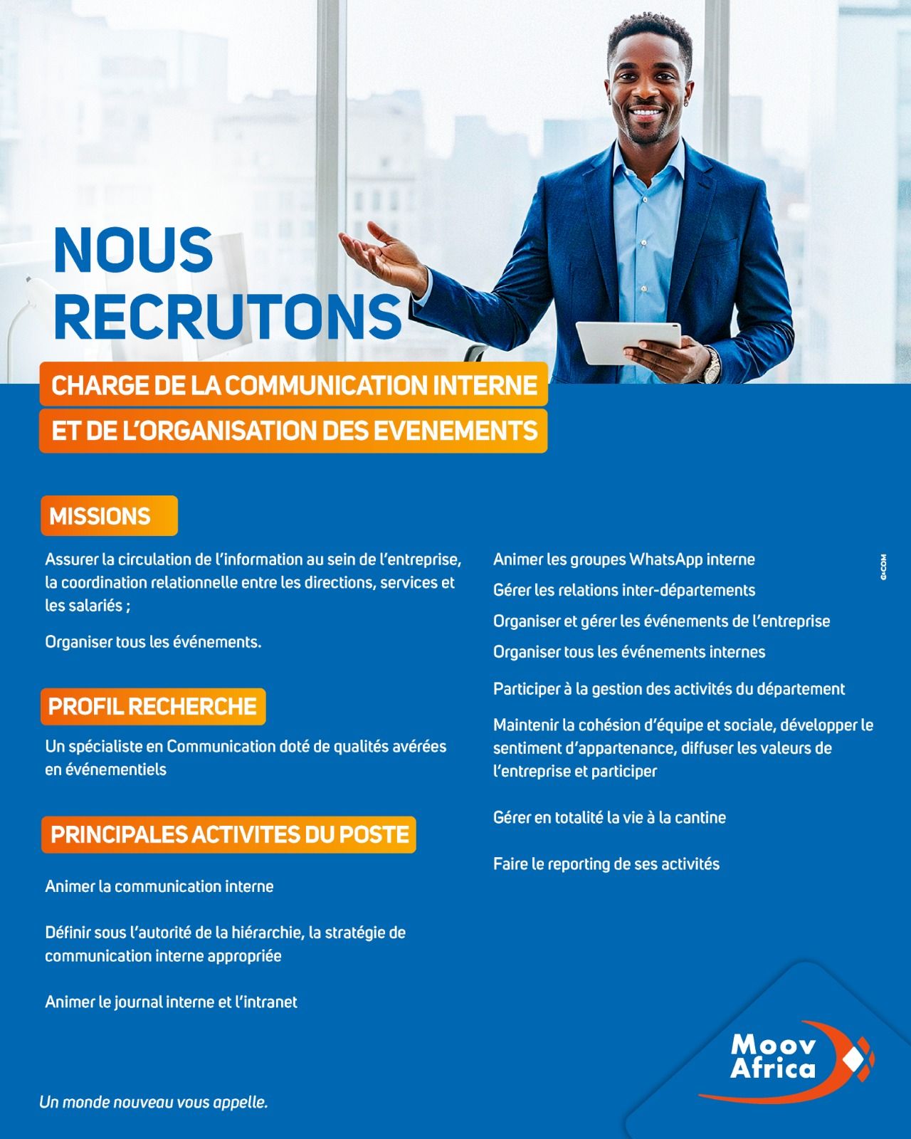 Moov Africa est l’un des plus grands opérateurs de téléphonie mobile en Afrique de l’Ouest. Filiale du groupe Maroc Telecom, il est présent dans plusieurs pays africains et propose des services de voix, internet 4G et des solutions de transfert d’argent mobile (Moov Money).