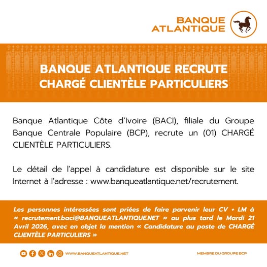 Banque Atlantique Côte d’Ivoire, filiale du groupe Banque Centrale Populaire (Maroc), recrute un (01) chargé clientèle particuliers.