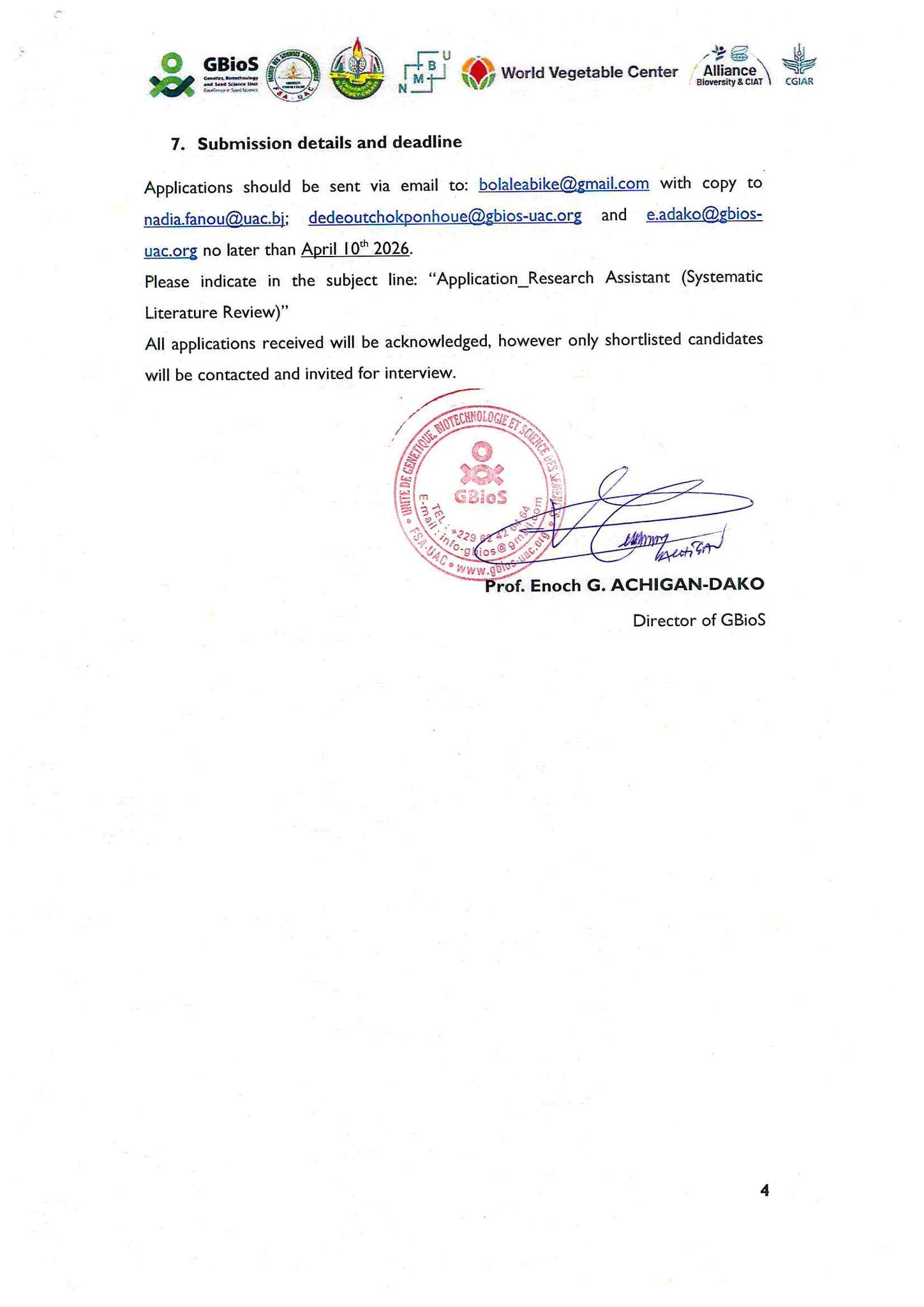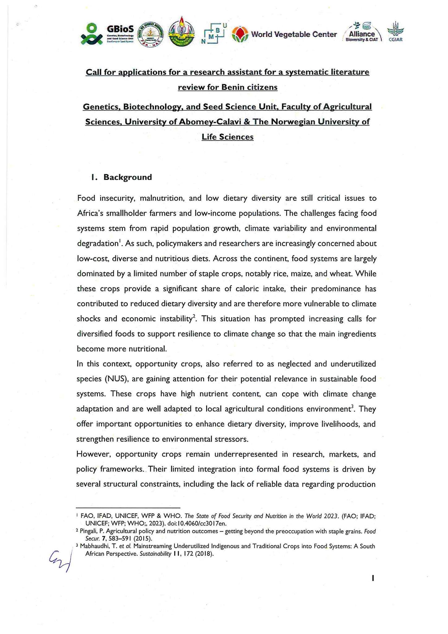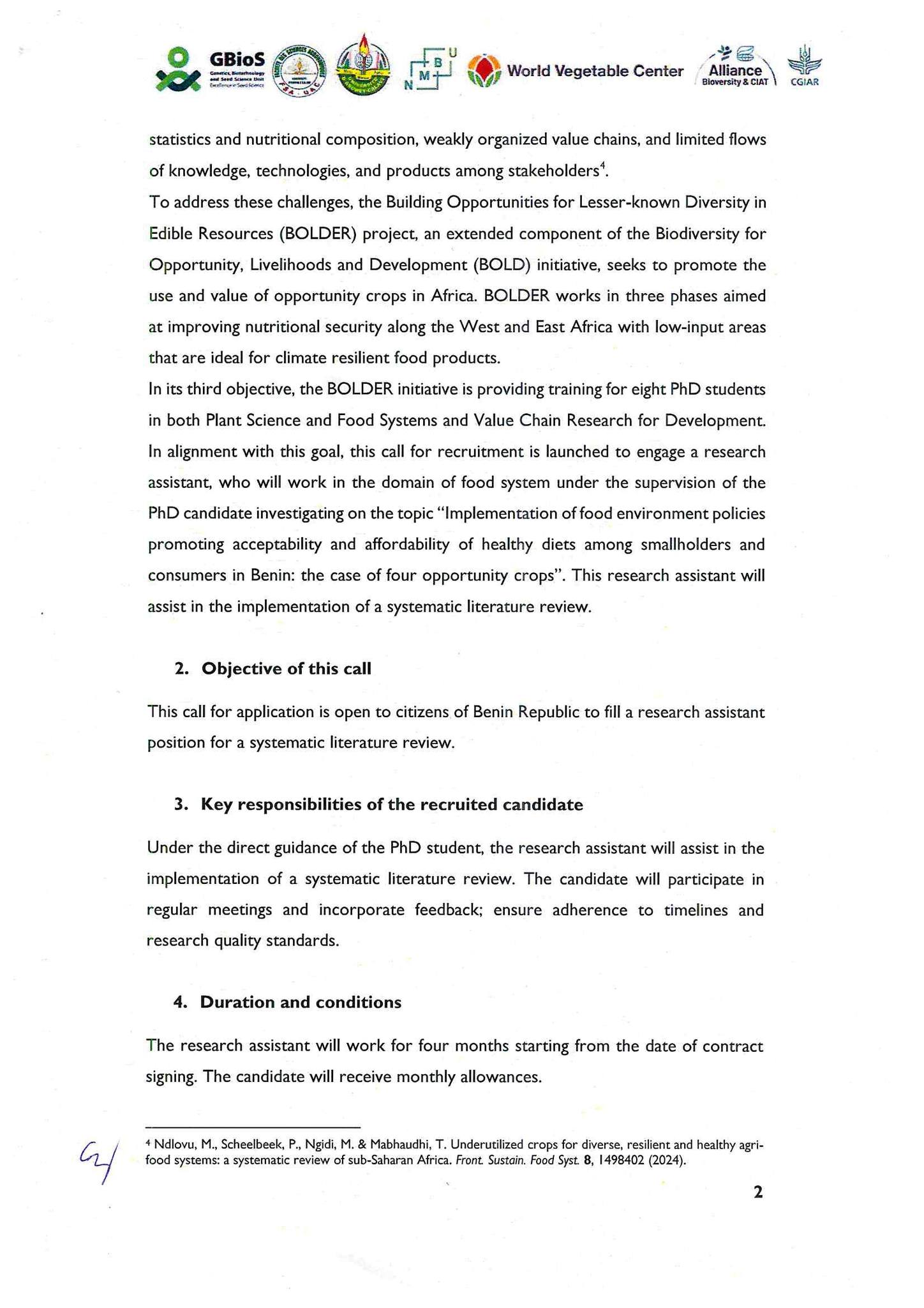 Un appel à candidatures est actuellement ouvert pour un poste d’Assistant(e) de recherche dans le cadre d’un projet de recherche au Bénin. Le/la candidat(e) sélectionné(e) contribuera à la mise en œuvre d’une revue systématique de la littérature sous la supervision d’un doctorant.